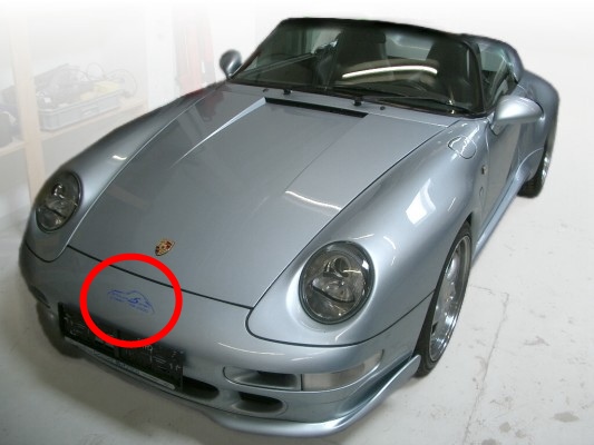 Spannend finde ich den Aufkleber auf dem Frontstoßfänger. Mir kommt das Logo bekannt vor, ich kann es aber nicht zuordnen. Vielleicht erkennt es ja jemand von Euch. Wer auf einem 993 Speedster wirbt, kann bestimmt auch noch mehr Details liefern... :wink: