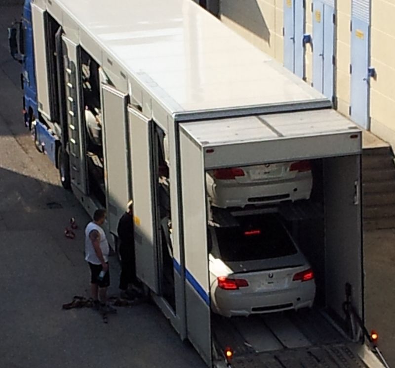 ist mir da vielleicht ein M3 Sondermodell vor die Linse gesprungen? Auf Besuch bei einem Geschäftspartner konnte ich sehen, daß auf einen geschlossenen (!) Autotransporter mit großer Eile fabrikneue M3 verladen wurden, die allesamt den Schriftzug "Carbon Edition" auf der Flanke trugen. In der Halle, aus der sie herausgefahren wurden, müssen sicherlich insgesamt ein paar Dutzend identische M3 geparkt sein - alle in diesem "elfenbeinweiß" mit dunkelrotem Schriftzug und schwarz lackierten Felgen. "Carbon Edition" läßt ja auf einiges an verarbeitetem Carbon schließen. Die Wagen waren jedoch komplett lackiert, also kein "Sichtcarbon".