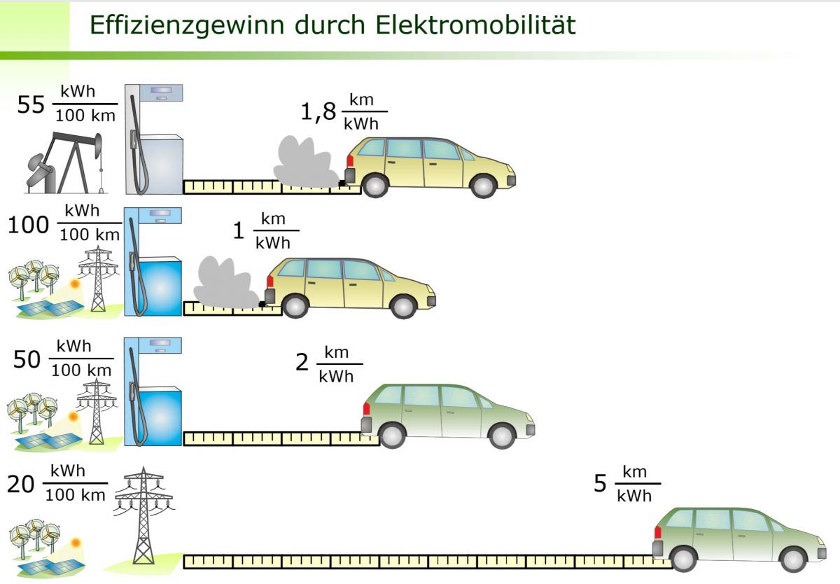 Gezeigt wird von oben nach unten der normale Verbrenner, Wasserstoffverbrenner, Brennstoffzelle, Batterie: