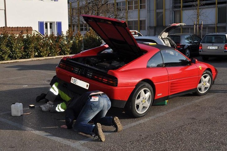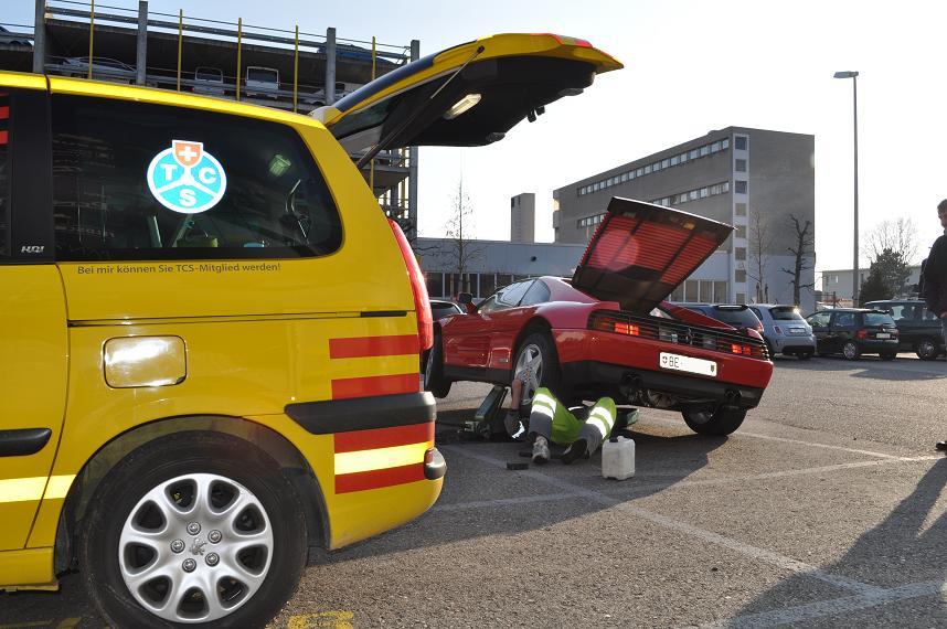 Während des Besuches im Pantheon wurde er darauf aufmerksam gemacht, dass sein Ferrari Benzin verliert. Beim Auto angekommen, lief das Benzin in einem Rinnsal unter dem Auto hervor. Von der Seite konnte man nicht richtig erkennen, woher es kam, allerdings war es ein richtiger kleiner "Wasser"fall. Da es im Pantheon unerklärlicherweise keinen Ölbinder gibt, avisierte Gian die Polizei, während Günther den TCS am Draht hatte. Immerhin konnte dann ein Wagenheber und eine Auffangwanne organisiert werden, welche dafür sorgen sollte, dass das Benzin nicht in die Kanalisation gelangt.