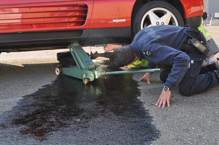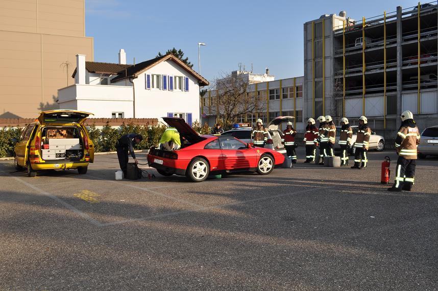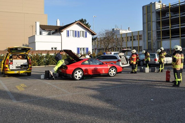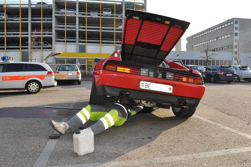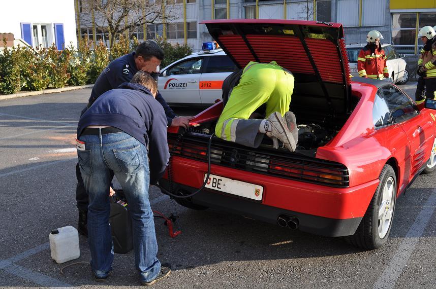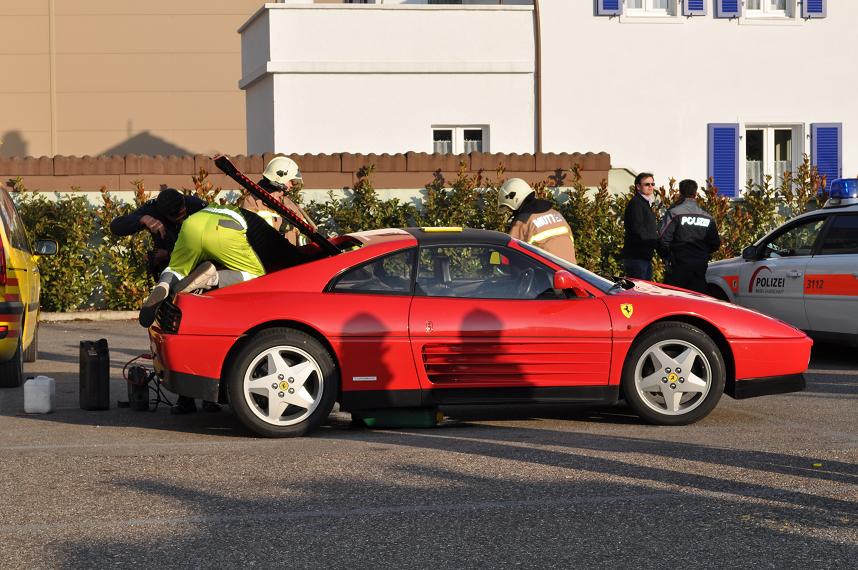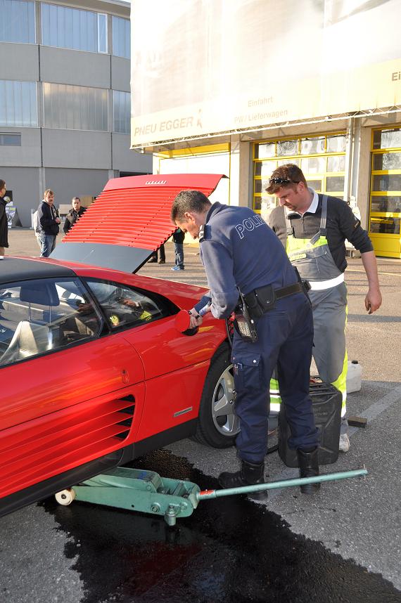 Gewissenhaft arbeitete man am Ferrari weiter, während das Aufgebot der Feuerwehr ihrer Arbeit nachkam. Das Leck hatte man in der Zwischenzeit auch gefunden, es handelte sich um ein Loch im Tank.