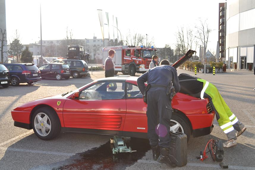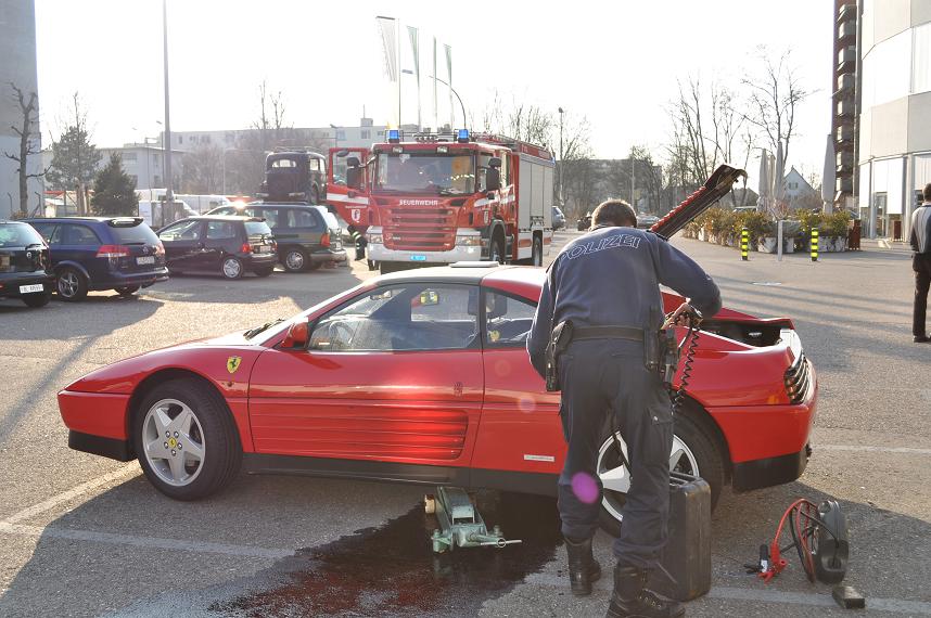 Nach einer gefühlten Ewigkeit traf dann auch der Abschleppwagen ein um den Ferrari aufzuladen. Die Feuerwehr musste ebenfalls warten da man das Benzin unter dem Ferrari ebenfalls noch mit Bindemittel auffangen musste.