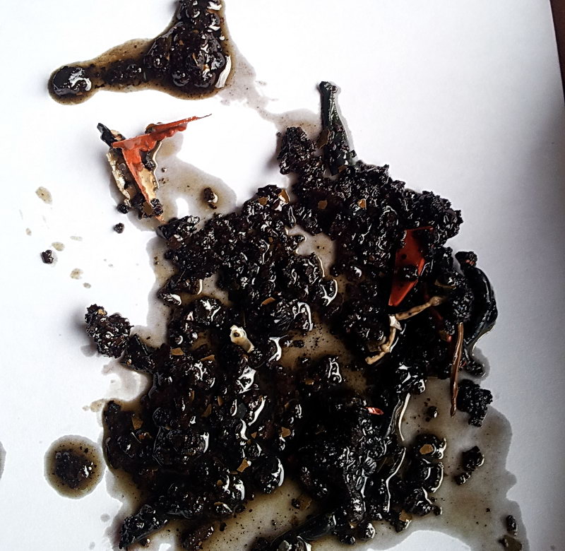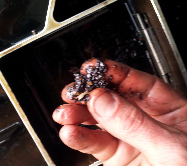 Scharfkantig, metallisch. Magnetisch ist das Zeug teils auch, teils verrostet - teils Lagerschalen-Material, das rote Zeug ist Dichtmasse. Woher die verrosteten Teile kommen - völliges Rätsel.