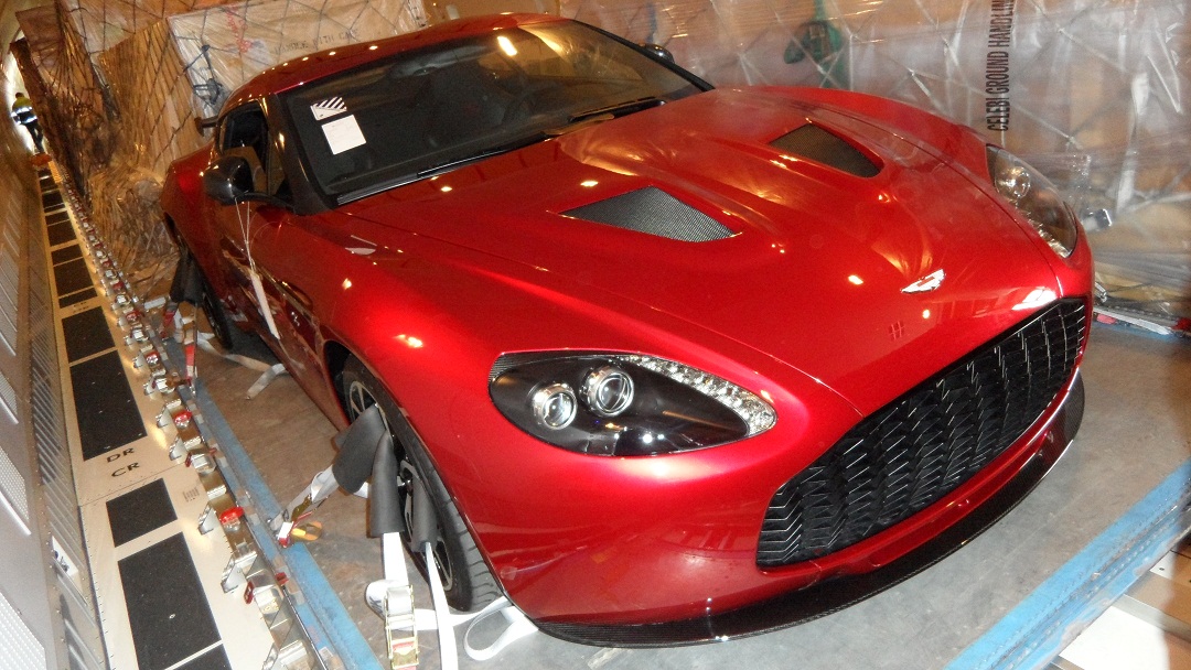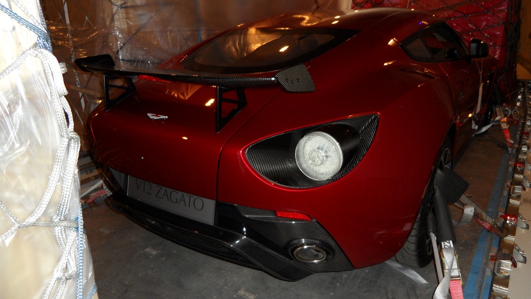 Einer der auf 150 limitierten Aston Martin V12 Zagato verzurrt ihm Flieger in Richtung USA.