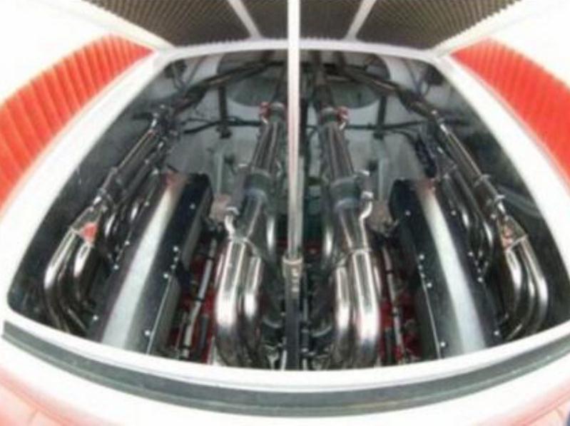 die verbauten Maserati V 8-90° mit je 6.458 cm³ - 4 Weber 48 IDM/Doppelzündung – haben je eine Nennelsitung von 580 PS @ 6.000 1/min.