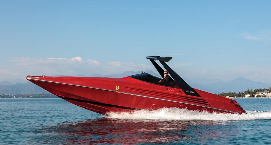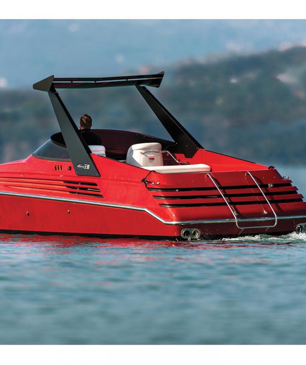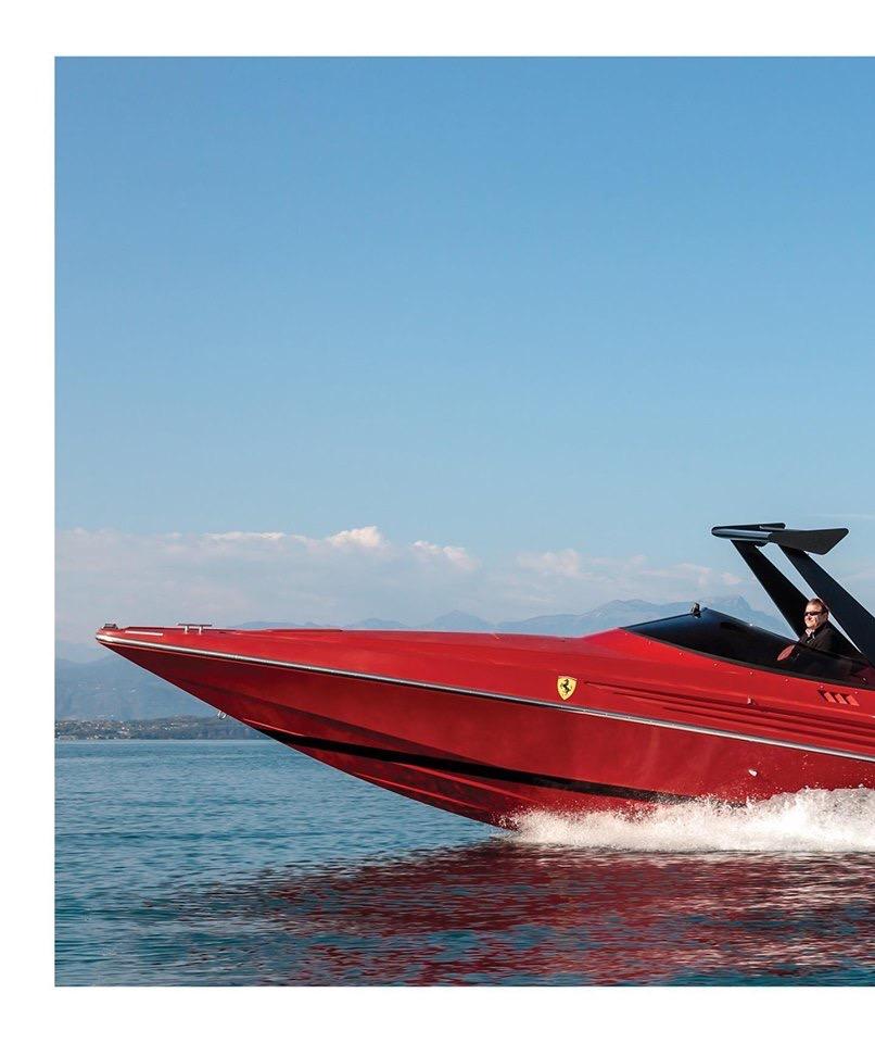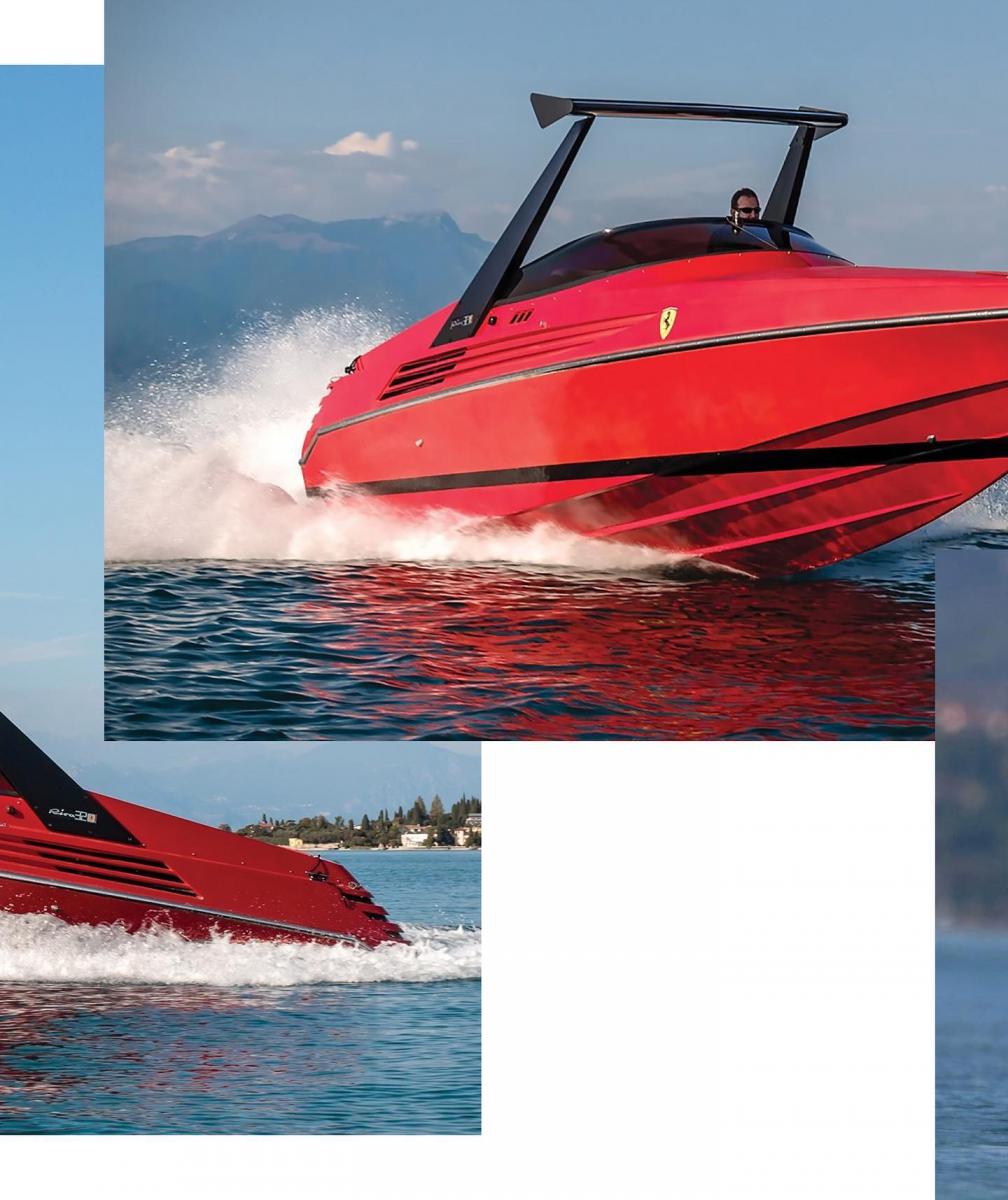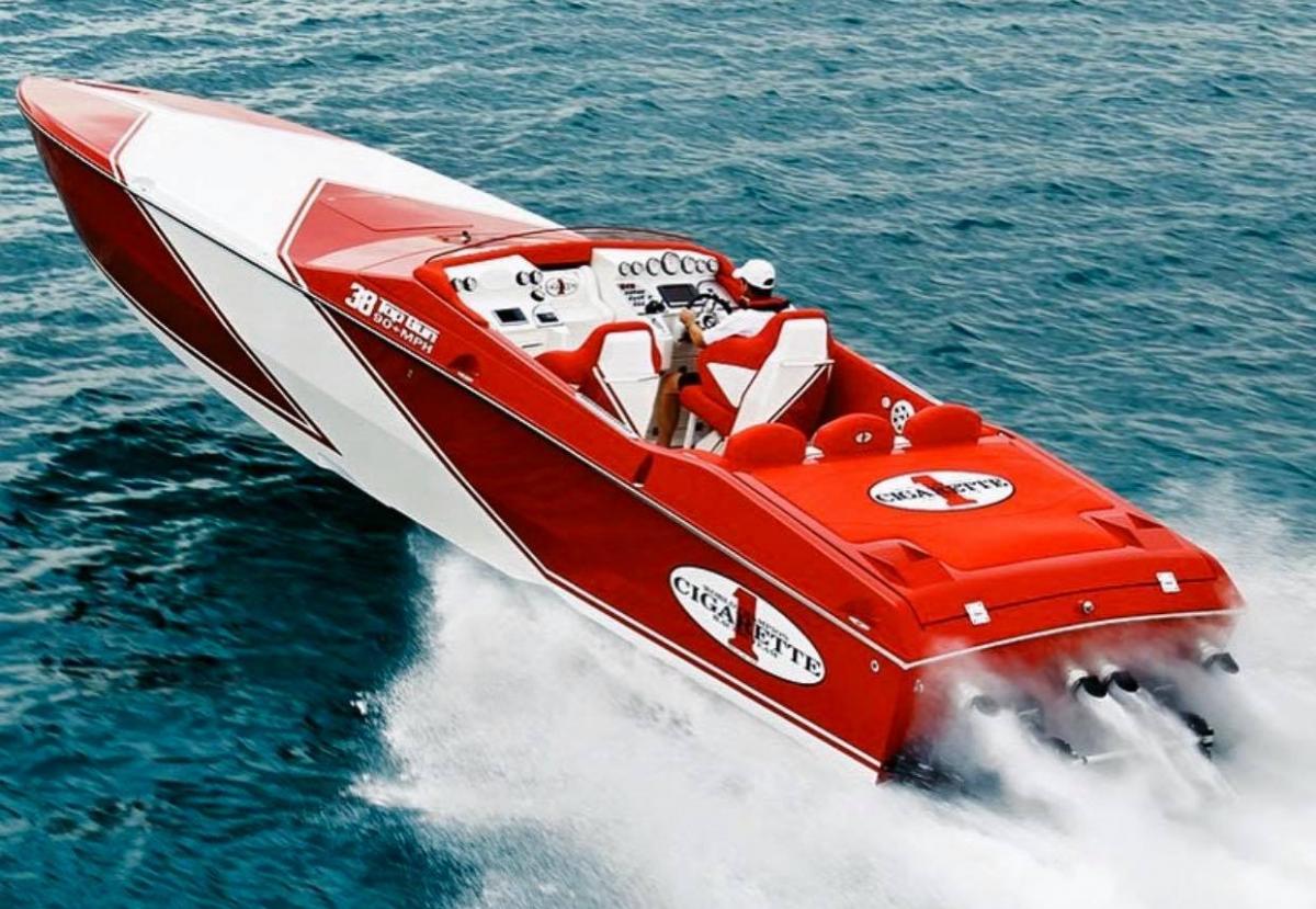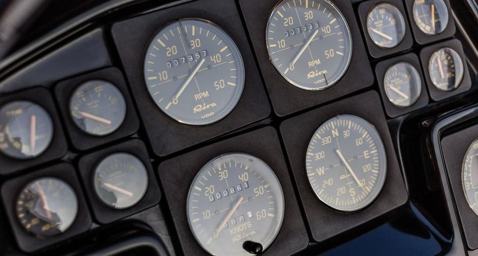 hier mit 2x750 ps, die gut für 90 knoten sind. nach heutigen masstäben schon leicht untermotorisiert, das haben schon viele boote am gardasee.