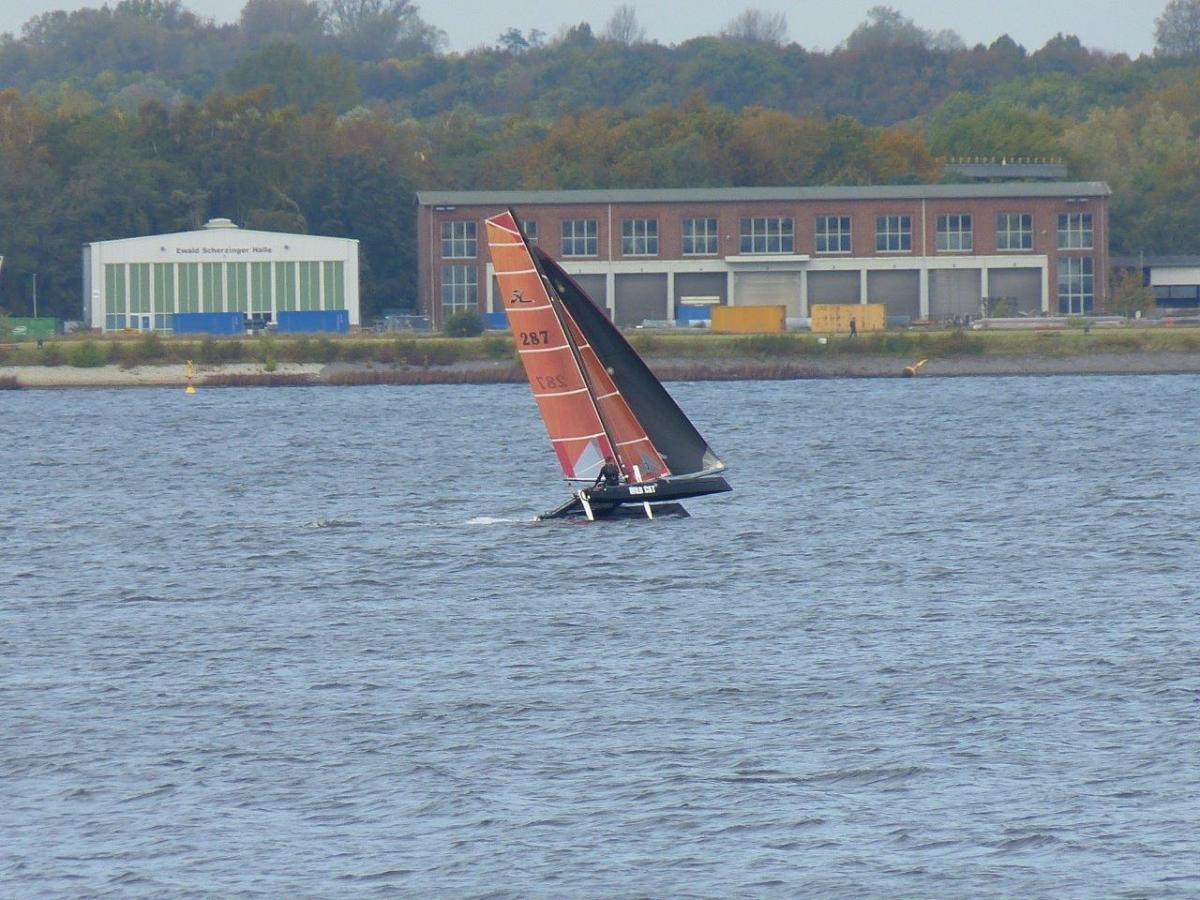 Katamaran F18 Klasse (Achtzehn Füße lang), an sich ein 2-Mann Schiff, geht mit etwas herumturnen aber auch allein.