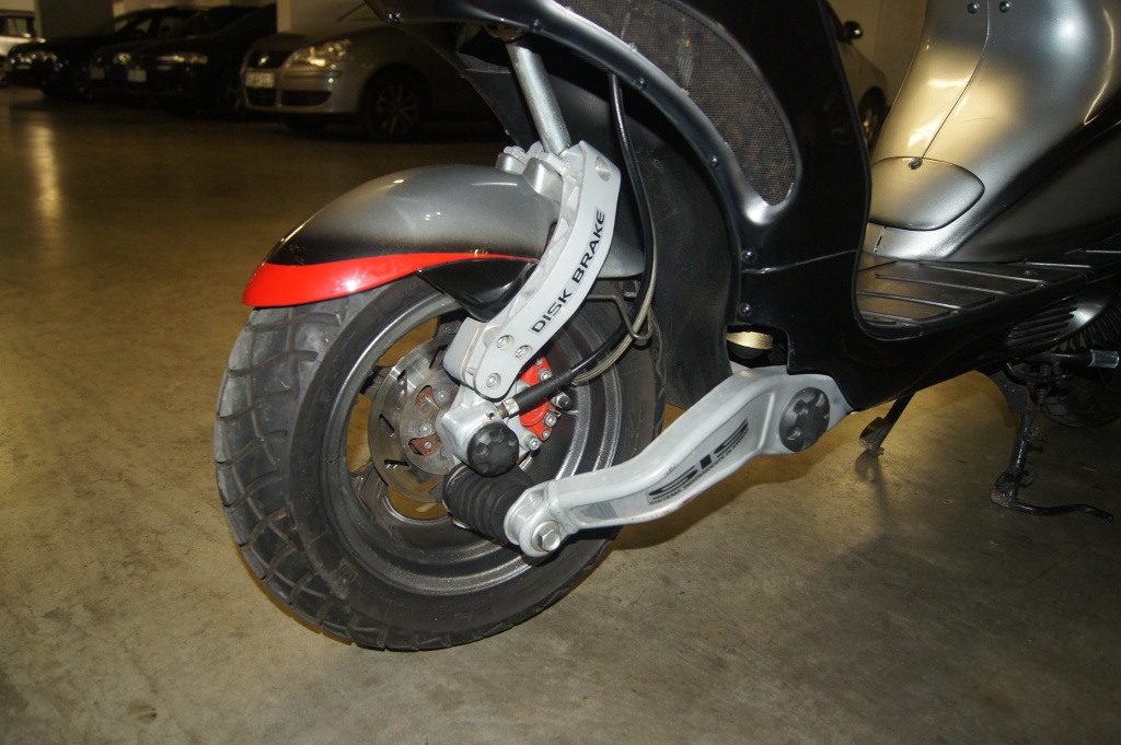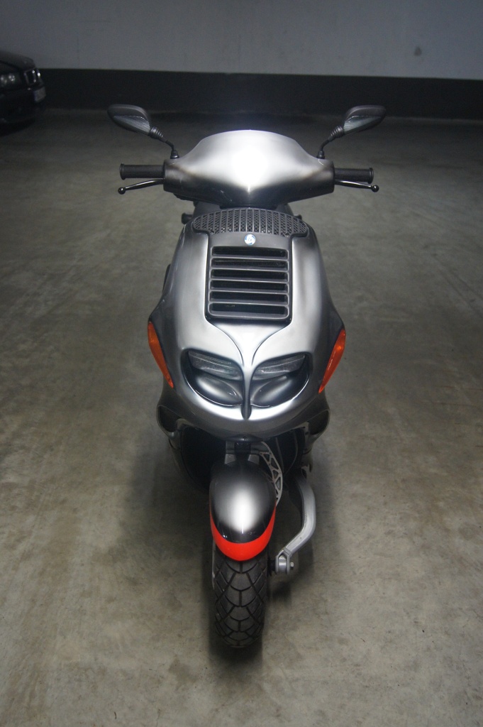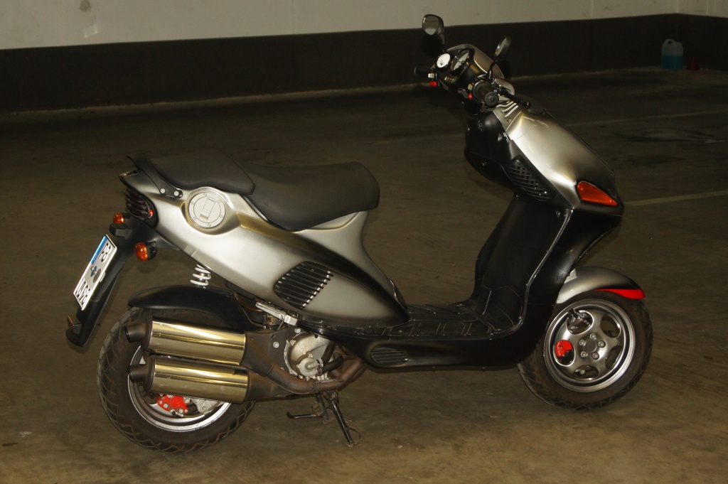 Zu sehen ist ein "Italjet Formula 125" Bj 1998, mit nur etwa 2000km Laufleistung in 14 Jahren. Die Lackierung ist im Stil des McLaren-Mercedes von Mika Hakkinen der 1998 mit seinem Dienstwagen F1-Weltmeister wurde. Der Roller hier hat ein paar technische Besonderheiten wie den 2-Zylinder 2-Takt Motor, den es sonst nirgends gibt und auch nicht ganz unproblematisch ist. Bei mir ist noch alles okay und ich hoffe es bleibt auch erst mal so. Dank strammen 14 PS ist man im Stadtgebiet sehr flott unterwegs, hinzu kommt durch den 2-Zylinder ein einmalige Klang der sehr charakteristisch ist. Auch ganz besonders ist die Achsschenkellenkung vorne (siehe Bilder). Ich muss mich zwar erst noch etwas dran gewöhnen, aber gerade beim starken bremsen hat diese den Vorteil das der Roller vorne nur minimal einfedert.