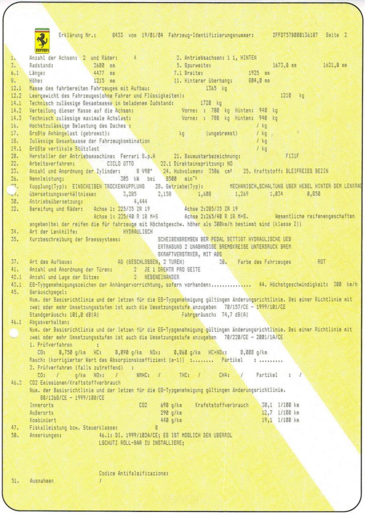 2. Der Stradale Auspuff wird mit Papieren von Ferrari geliefert (oder man besorgt sich diese) die die mögliche Zulassung bescheinigen. Dann beim TÜV eintragen lassen. Ansonsten wäre das Fahren ohne Betriebserlaubnis und da ist man dann im Strafrechtlichen Bereich = ungünstig sofern man das Ziel verfolgt seinen Führerschein länger zu behalten.