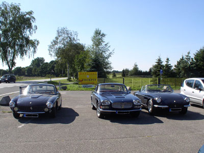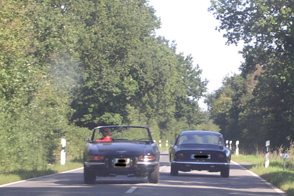 Wir haben in der Umgebung einige Routen ausgekundschaftet, die herrliches Autowandern durch Wald und Wiesen erlauben. Ab der zweiten Ortschaft sind auch kurz mal sanfte 4000 erlaubt und man fühlt, wie der V12 immer besser reagiert. Dann geht es eine lange Gerade durch die Felder bis zum Waldrand. JA! Die Öltemperatur geht hoch! Mit Zwischengas in den Dritten (der Zweite geht noch immer nicht) und mal voll drauf. Genau auf Geräusche achten und bei 5500 erstmal aufhören. Jetzt kommt dieses typische Jaulen, das auch aktuelle Ferarries haben. Die Walddurchfahrt hat viele Kurven und kleine Hügel, bedeutet viel Schalten und volle Konzentration. Am Ende gibt es einen kleinen Parkplatz, wo wir kurz anhalten und Adrenalin abbauen und einmal um die Autos gehen. Riecht nix, tropft nix? Durchatmen und weiter. Es geht fast gerade und sehr übersichtlich durch die Felder zur nächsten Ortschaft. Wenn kein Gegenverkehr droht, fahre ich ersten und zweiten (ja, der geht jetzt) fast voll. Bitte nicht über 7000 -- er ist generalüberholt und fährt schon bleifrei (der GTC braucht Zusatz). Dieses Geräusch jenseits der 5500 ist unbeschreiblich, der Vortrieb brachial. Bei 150 ist Schluss, wir sind auf der Landstraße und wollen nicht von den Anwohnern mit Eiern beworfen werden.