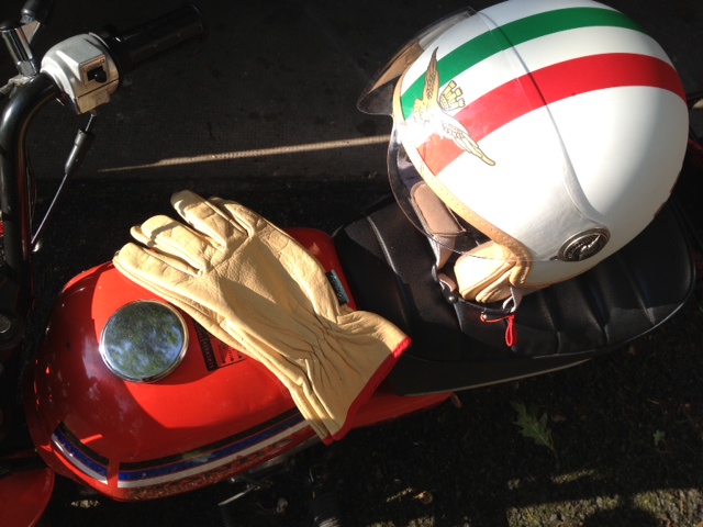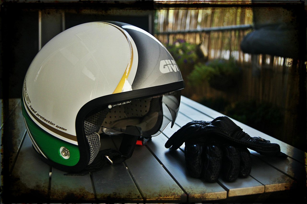 Nach intensiver Suche bin auch endlich bei meinen persönlichen Zweirad "Essentials" fündig geworden. Passend zum silbernen Italjet Formula 125 ein, wie könnte es anderes sein, italienischer Jethelm. Genauer ein GIVI X.05 tricolore mit leicht getöntem, innen liegendem Visier. Dazu ein Paar kurze Sommerhandschuhe aus weichem Ziegenleder welche sich stets geschmeidig tragen lassen und dank der ober seitigen Perforierung auch bei höchsten Temperaturen luftig bleiben. Firma Highway 1, gefunden bei Louis.de