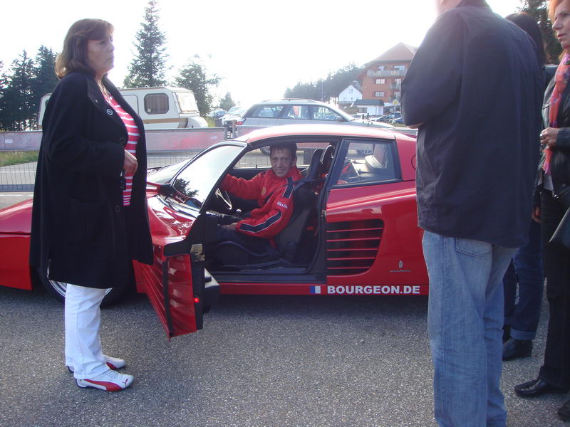 Nachdem ich mir am Freitag zwei Vorträge angehört hatte, fuhr ich von dort direkt zu Bayerpower, um mit ihm über den 512 TR zu sprechen. Anschließend fuhr ich zum Hotel, in dem wir übernachteten. Zuerst checkte ich ein. Als ich an der Rezeption stand, ging Biggi hinaus, um nach mir zu sehen, ob ich bald käme. Nach der Anmeldung ging ich zum Tisch, an dem die Leute vom Testarossa Treffen saßen. So haben Biggi und ich uns gerade verpasst. Sie sah draußen nach mir und ich saß am Tisch und sah nach ihr Ausschau...