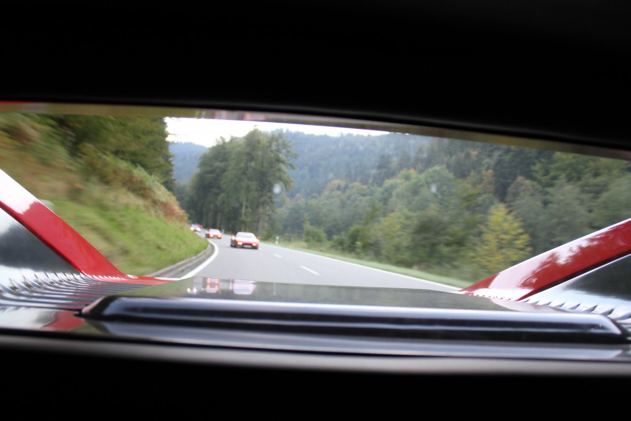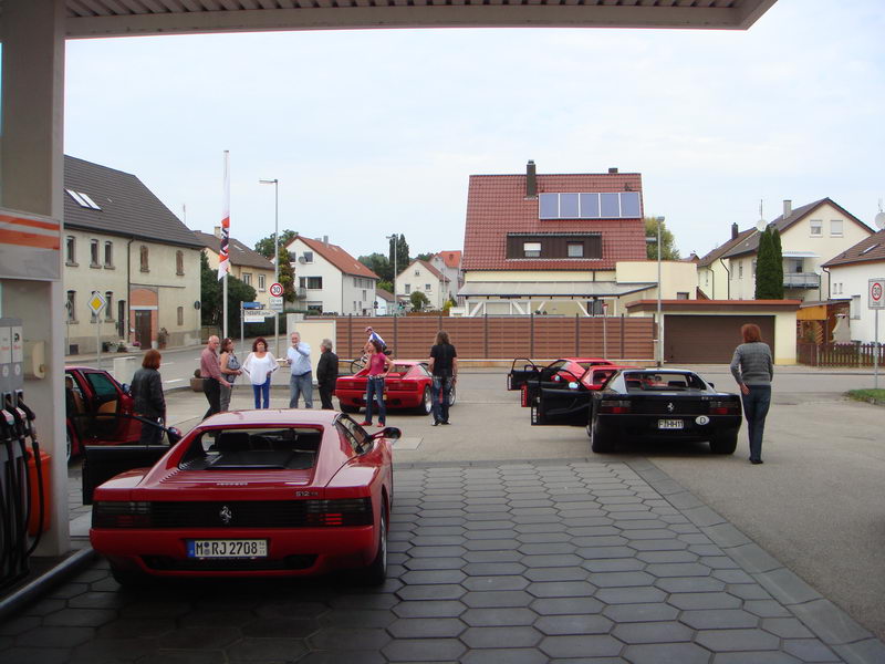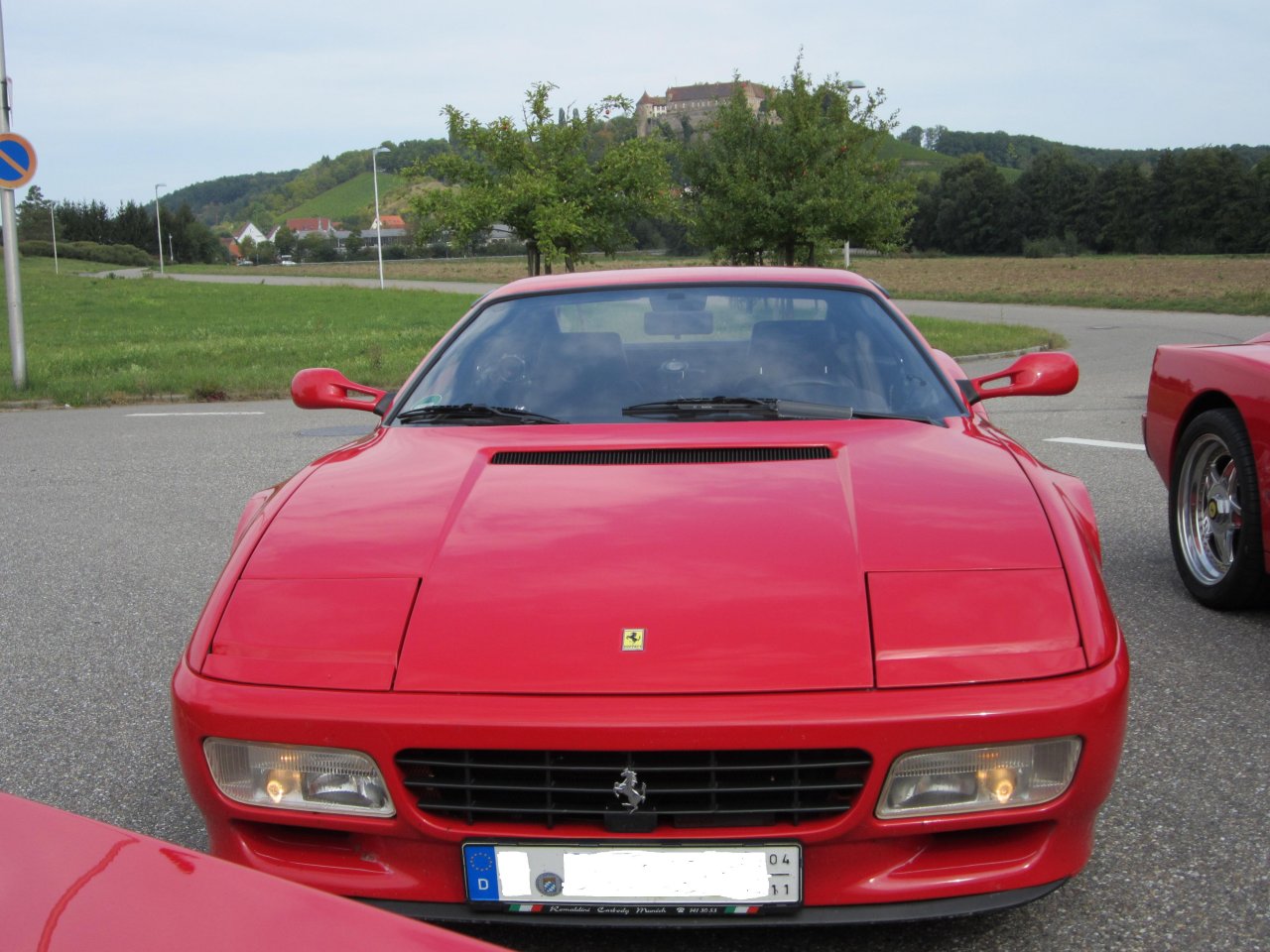 Wir trafen uns dann wieder über einen sTrip beim Eros Center :wink: beim Meilenwerk. Sonntags waren wir etwas weniger Autos und das Wetter war sehr angenehm und trocken. Wir unterhielten uns viel über die Baujahre, Anlasser, Auspuffe, Reifen, Motorraumdeckel und vieles mehr. Dabei entstanden die Bilder, auf denen wir die Motorraumdeckel offen haben. Leider haben uns Michael und Verena schon verlassen, der Rest düste los zum Porsche Entwicklungszentrum, wir auf der Teststrecke fuhren - leider nur gedanklich 8) Weiter ging es über einen kurzen Tankstellenaufenthalt zu einer kleinen Wendeschleife, um die tollen Ferris für die Ewigkeit zu digitalisieren - inklusive der kleinen Fahrer- und Beifahrertruppe. Und weiter ging es wieder einmal zum Essen... :) Irgendwie habe ich das Gefühl, wir haben die ständig nur gegessen, gesoffen und getratscht... Aber eigentlich kamen wir ja auch dafür zusammen. Nach dem hervorragenden Essen fuhren wir zur Trettenburg. Nachdem wir dort wieder genügend getrunken haben, hat sich das Grüppchen langsam aufgelöst. Biggi und ich saßen noch als letzte an der Burgmauer, als ein kleiner Junge kam und seiner Mutter lauthals zurief: " Mama, das sie die, denen die Ferraris gehören!". Er kannte sich für sein Alter schon ganz gut aus und wollte dies und das wissen. Schlussendlich haben auch wir uns verabschiede und sind aufgebrochen. Ich fuhr zu einer Ausbildung in Richtung Nürnberg. Die Autobahn und Straßen waren recht leer. Ein sportlicher Audi und Mercedes Fahrer konnte ich daher leicht ärgern... :lol: