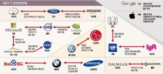 Ich habe etwas interessantes gefunden. So sieht die Zusammenarbeit momentan aus, wenn es um die Entwicklung autonomes Fahrens und E-Fahrzeuge geht.