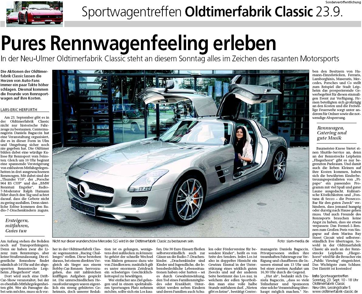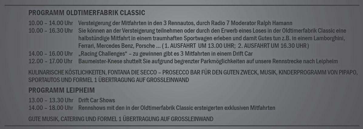 Am Nachmittag wird die Veranstaltung um den stillgelegten Flugplatz in Leipheim erweitert. Die Gäste haben die Möglichkeit die Mitfahrt in einem von 3 echten Rennwägen zu ersteigern. Diese Fahrten werden dann auf dem Fliegerhorst Leipheim durchgeführt.