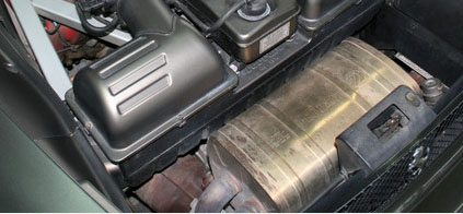 Gischtwasser scheint von unten in den Motorraum zu spitzen, denn man sieht deutlich die Korrosion (also Rostbelag) im unteren Motorraumbereich und beiderseits hinten neben dem Dämpertopf.