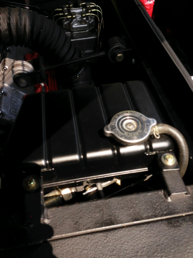 Der Überdrückbehälter für das Kühlwasser wurde ebenfalls - wie auch viele hier nicht sichtbare Teile - pulverbeschichtet. Ein User aus diesem Forum hat mir noch gezeigt, dass auf diesem Behälter eigentlich noch ein paar technische Daten in Form eines Aufklebers gehören. Der MUSS natürlich auch wieder drauf - ist aber nicht eilig! :D (man kann es ja auch übertreiben!)
