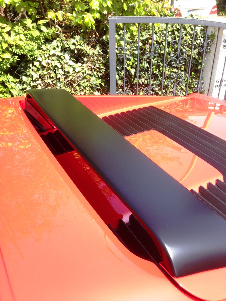 Der Spoiler auf der Motorhaube ist nun wieder so, wie er eigentlich immer hätte sein müssen - SCHWARZ! Die alte Farbe wurde vollständig abgetragen, der Spoiler neu verfüllert und dann in einem perfekten mattschwarzem Lack wieder wie neu hergerichtet!