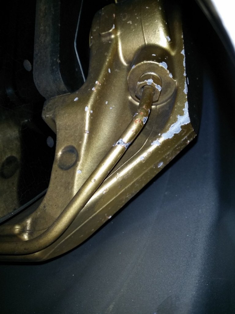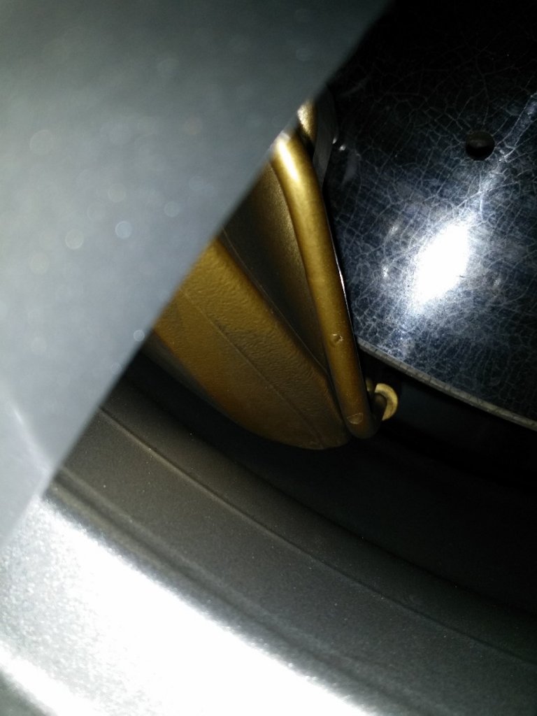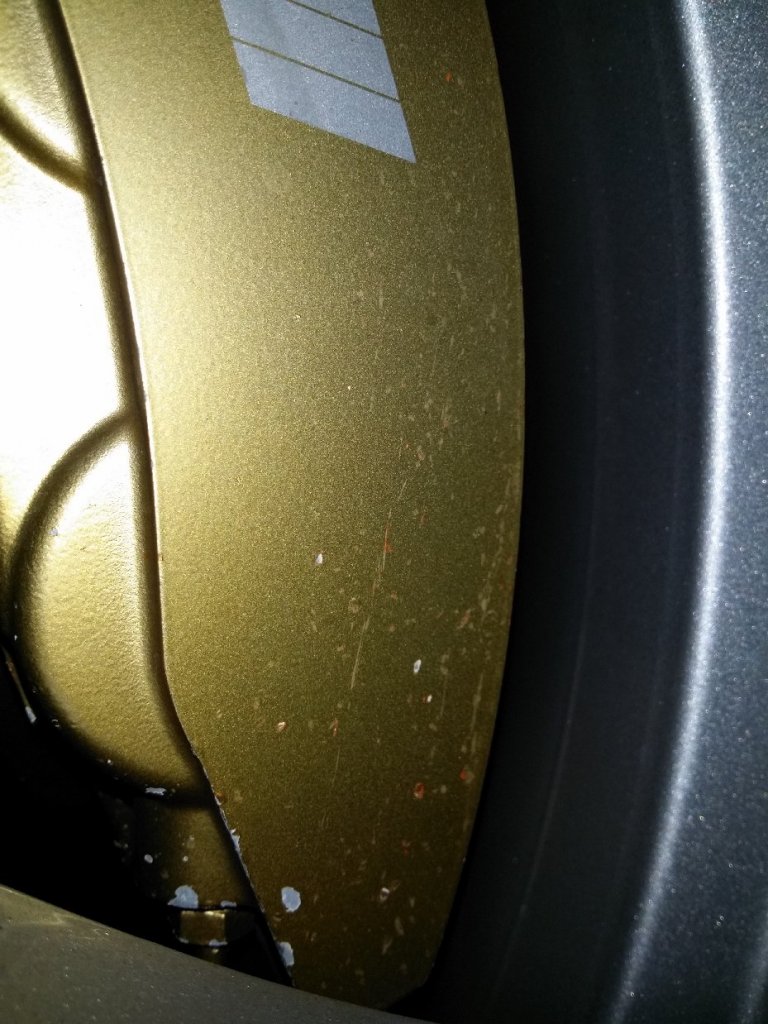 Bei meinem M5 F10 LCI löst sich die goldene Farbe vom vorderen Bremssattel der Keramik Bremsanlage. Links sieht es aus wie Steinschlag, aber die Felge kann keinerlei Schaden. Rechts blättert die Farbe an zwei Stellen ab.