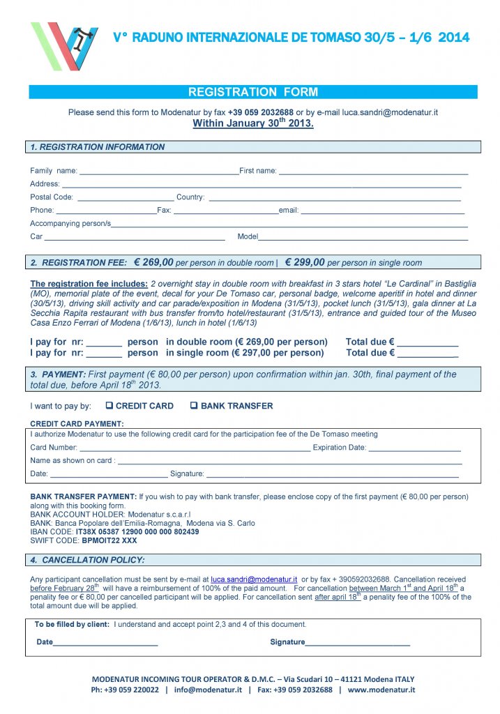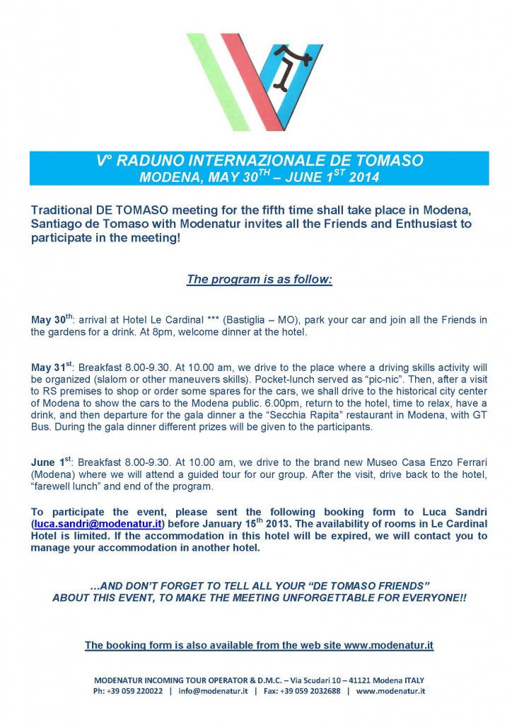 Ein Termin zum vormerken. Vom 30.Mai bis 1.Juni 2014 findet in Modena wieder ein De Tomaso Treffen statt. Mein Scanner hat leider gerade den Geist aufgegeben, aber Info, Programm und Anmeldeformular gibt es auch unter:
