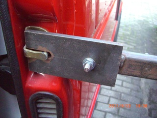 der hydraulische Wagenheber wird sodann am hinteren Ende der Tür unten (also etwa auf Schlosshöhe) angesetzt - natürlich unter der Holzlatte !