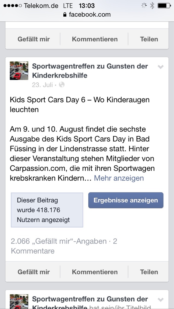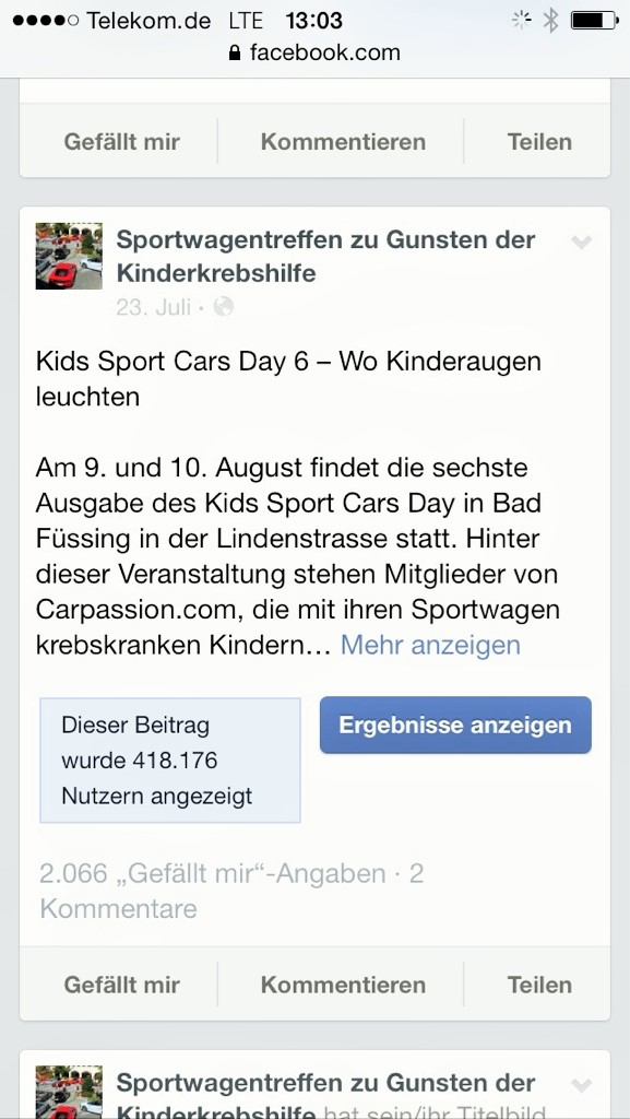 418000 Zugriffe über Facebook innerhalb 9 Tagen für das Sportwagentreffen am 9. u. 10. Aug. 14 in Bad Füssing und 2066 gefällt mir