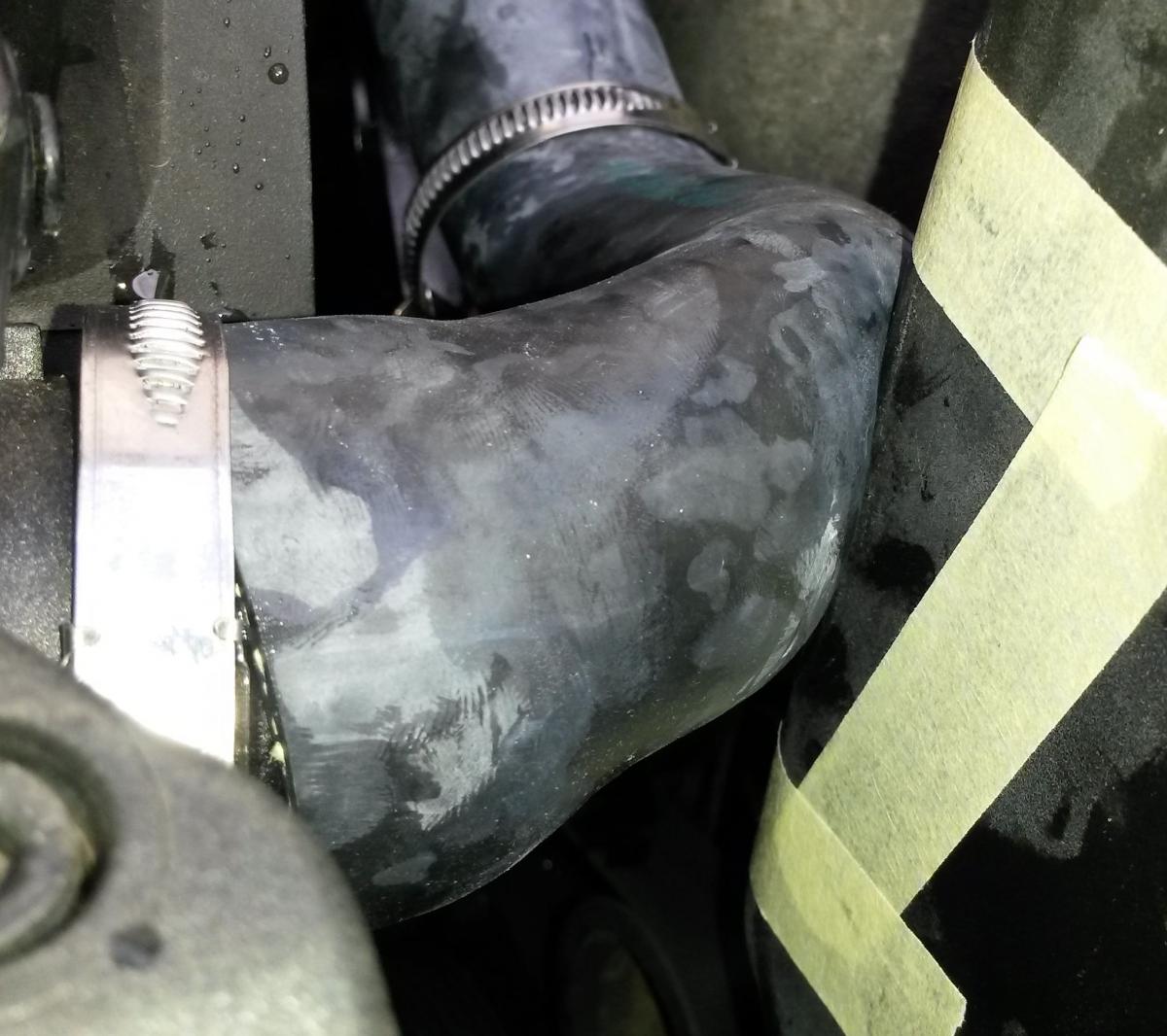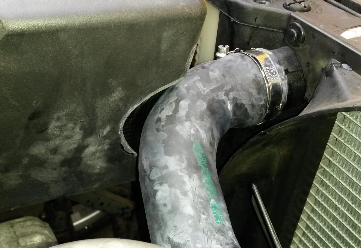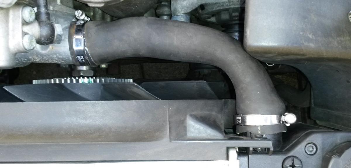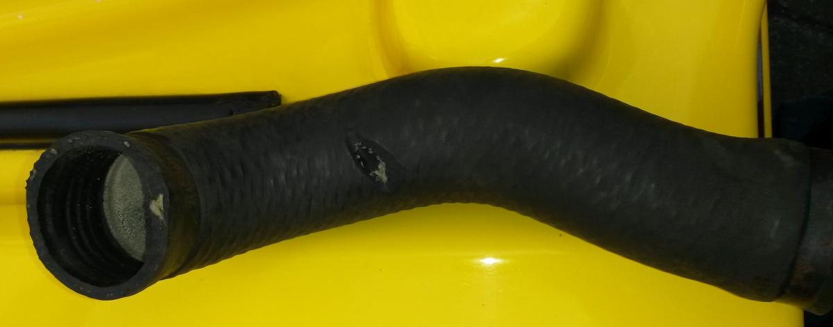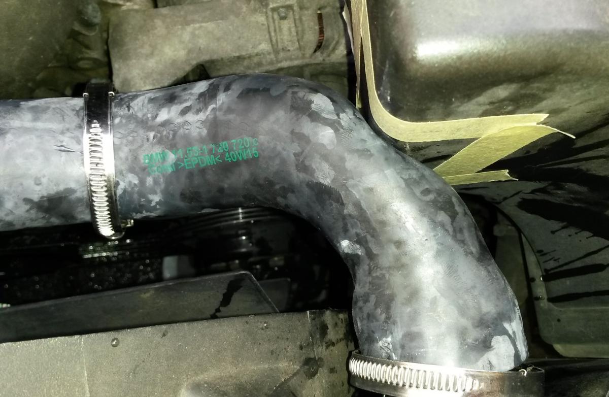Nach dem Frühlingsfest habe ich mir dann den originalen Verbindungsschlau Kühler/Thermostat, vom BMW E36 gekauft. Da der alte Schlauch schon immer am Luftfiltergehäuse gequetscht wurde und das mit dem Originalschlauch schlimmer wurde, habe ich eine Ausnehmung in den Kasten geschliffen und das Loch mit einer dünnen Platte verschlossen. Jetzt sind fast 20mm Platz, zwischen Lüfter und Schlauch, so daß keine Berührung mehr möglich ist, so sehr sich der Motor bei Lastwechsel auch in seinen Gummilagern bewegt. Wieso war das eigentlich geschehen, habe ich mich gefragt. Beim Wechsel des Kühlers habe ich den Schlauch wohl zu weit auf den Kühlerstutzen geschoben, so daß nur 10mm Platz waren und das hat offensichtlich auf Dauer nicht gereicht!.............