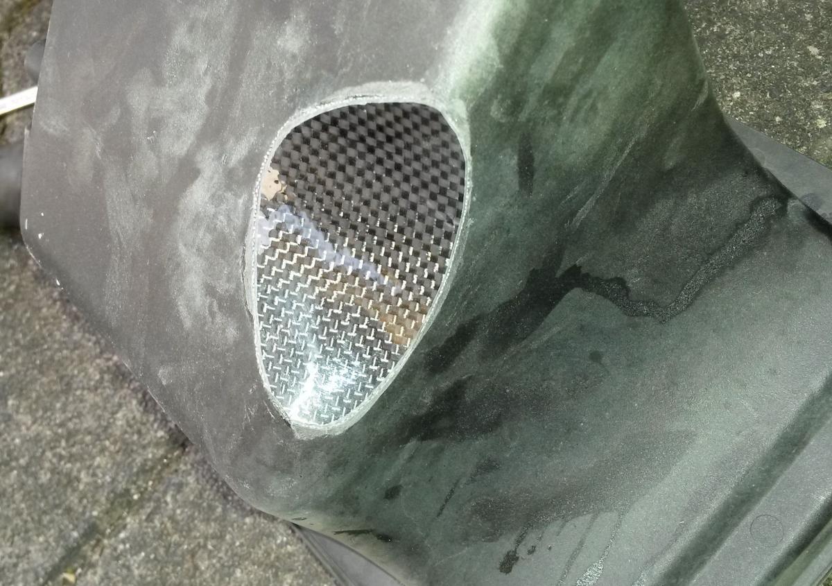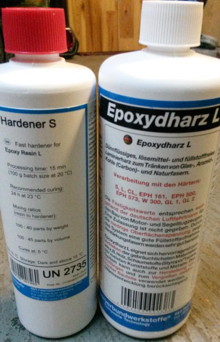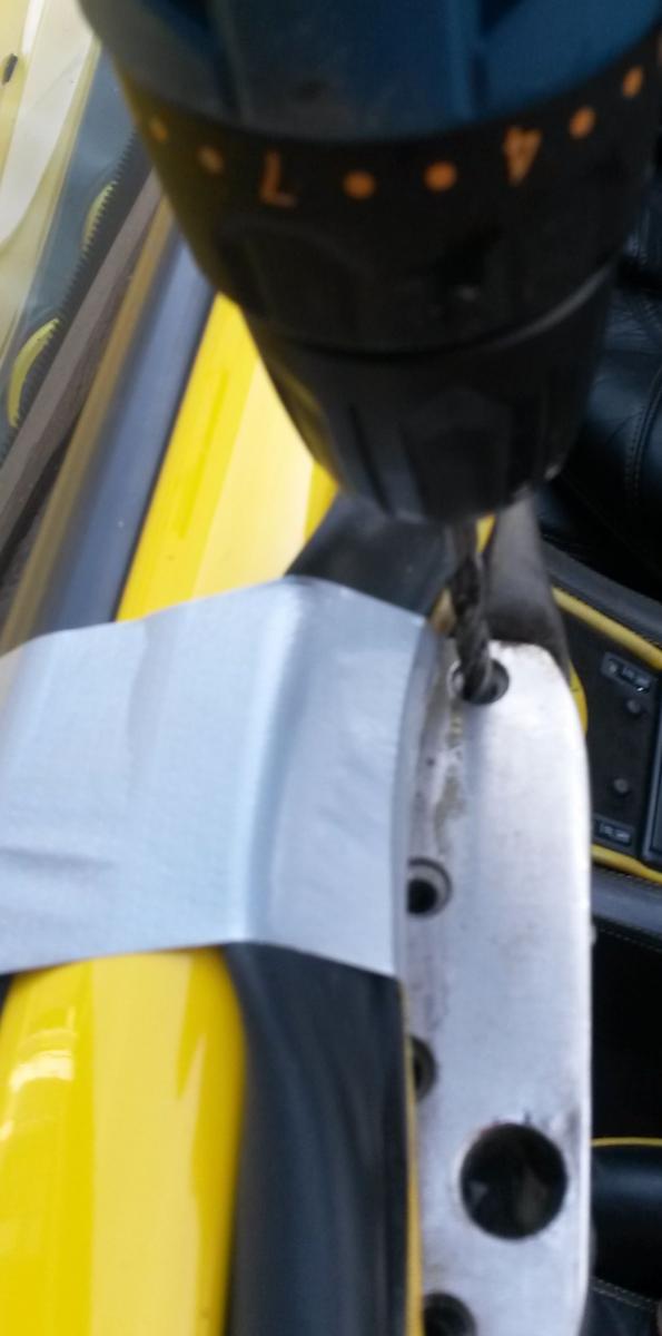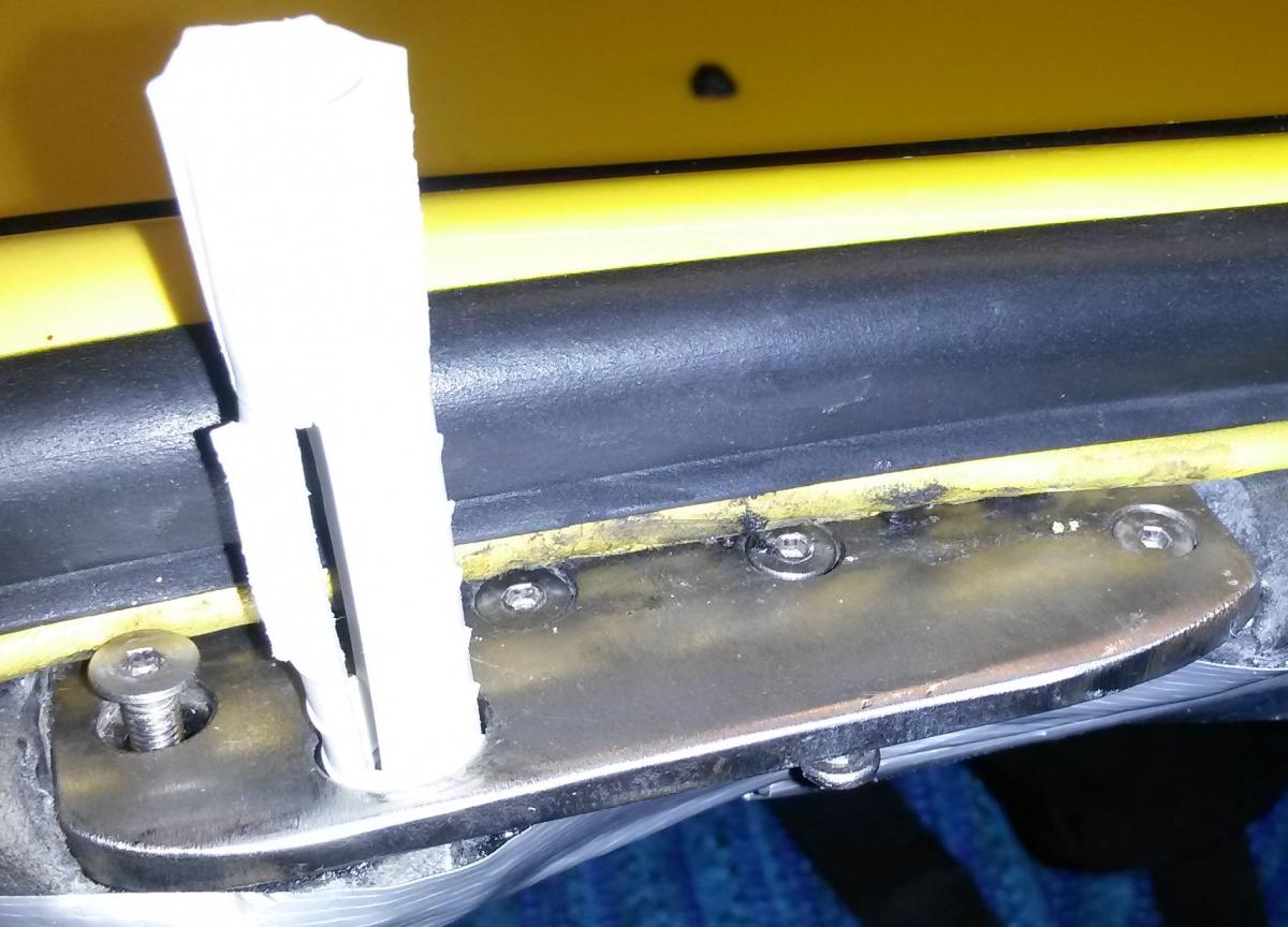Alle 4 Blechschrauben waren ausgerissen. Das Verriegelungsblech ist nur an den GfK-Scheibenrahmen geschraubt und es hing jetzt nur noch vorne an etwas Karosseriekleber. Darunter sah es wild aus: Zerbrochene GfK-Stücke und Krümel! Diese habe ich alle entfernt und mich dann entschlossen, Gewindeinserts einzukleben, um von den Blechschrauben, zu Gewindeschrauben zu wechseln, was übrigens auf der anderen Seite schon gemacht wurde. Da, wo noch genügend Material war, habe ich die Löcher einfach aufgebohrt (auf 8mm), indem ich das Verriegelungsblech, als Schablone benutzt habe. Da, wo das nicht mehr machbar war, mußte ich die Löcher mit einem kleinen Fräser und einer Minibohrmaschine vergrößern. Das war bei den beiden vorderen Schrauben der Fall, die unter der Dichtung sitzen. Bei den Arbeiten habe ich die Dichtung mit etwas Klebeband nach vorne gezogen, um Platz zu schaffen. Jetzt habe ich die Schrauben gewachst, so daß sie später herausdrehbar sind! Zur Vorbereitung auf das Einkleben, steckte ich die beiden vorderen Schrauben in das Verriegelungsblech und drehte die Inserts auf! Die Klebestelle mußte ich vorher nochmal aussaugen, damit kein Staub mehr drin ist. Zur Verklebung nahm ich kalthärtendes Epoxydharz. Damit später keine Harztropfen auf dem Sitz sind, ist natürlich alles mit einer Plane, oder alten Deck abzudecken!!!! Auch den Rand der Aufnahmefläche des Verriegelungsblechs habe ich mit Klebeband geschützt und abgedichtet! Nachdem ich ca. 40g Harz angerührt hatte (weniger ist schlecht, da sich nicht vorschriftsmäßige Mischungsverhältnisse stark negativ auf die Endhärte auswirken), teile ich das Harz auf 2 Becher auf. Im ersten Becher wird nur eine geringe Menge Kohlefaser-Mehl (zur Verstärkung des reinen Harzes) eingerührt, so daß alles noch sehr flüssig bleibt. Das Harz im 2.Becher habe ich so lange eingedickt, bis es spachtelbar wurde. Zuerst habe ich von der flüssigen Variante etwas in die Löcher laufen lassen. Die Gewindeinserts bestrich ich mit der steifen Variante und setzte die beiden vorderen Inserts in die Löcher. Mit einem kleinen Holz wurde jetzt jeder Hohlraum aufgespachtelt und danach noch mit dem flüssigeren Harz vergossen. Jetzt konnte ich das Verriegelungsblech mit Schrauben und Inserts unter die Dichtung schieben und die beiden hinteren Schauben ebenfalls eindrehen. Bitte nur so weit eindrehen, daß die Schrauben oben bündig abschließen, die Inserts aber ganz tief in den Löchern sitzen!!!! Ich habe zur richtigen Ausrichtung des Blechs, noch das Dach mit der intakten Seite verschlossen und die reparierte Seite von oben mit einen Winterrad beschwert.