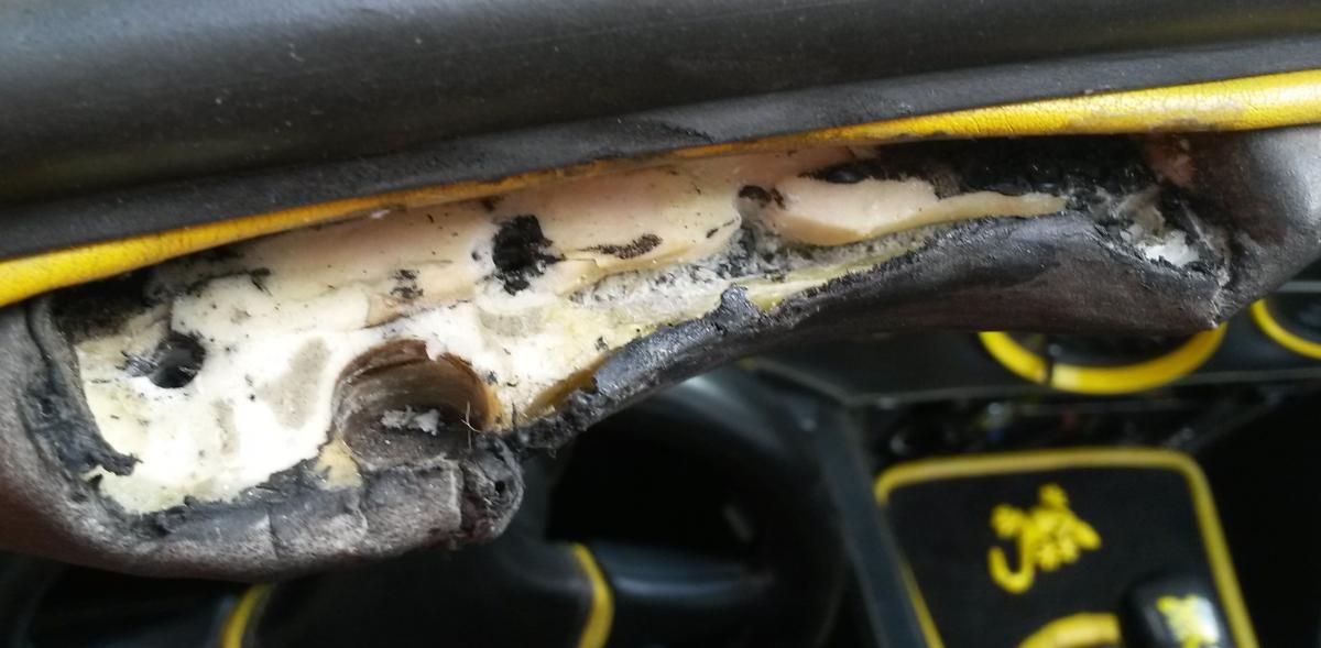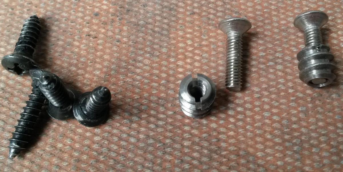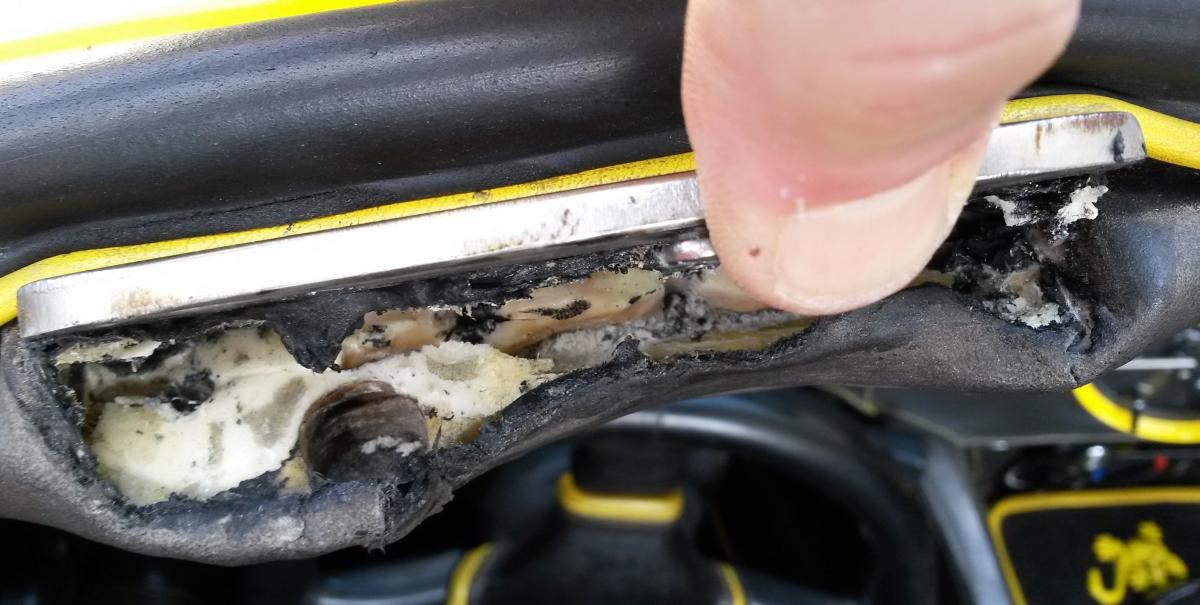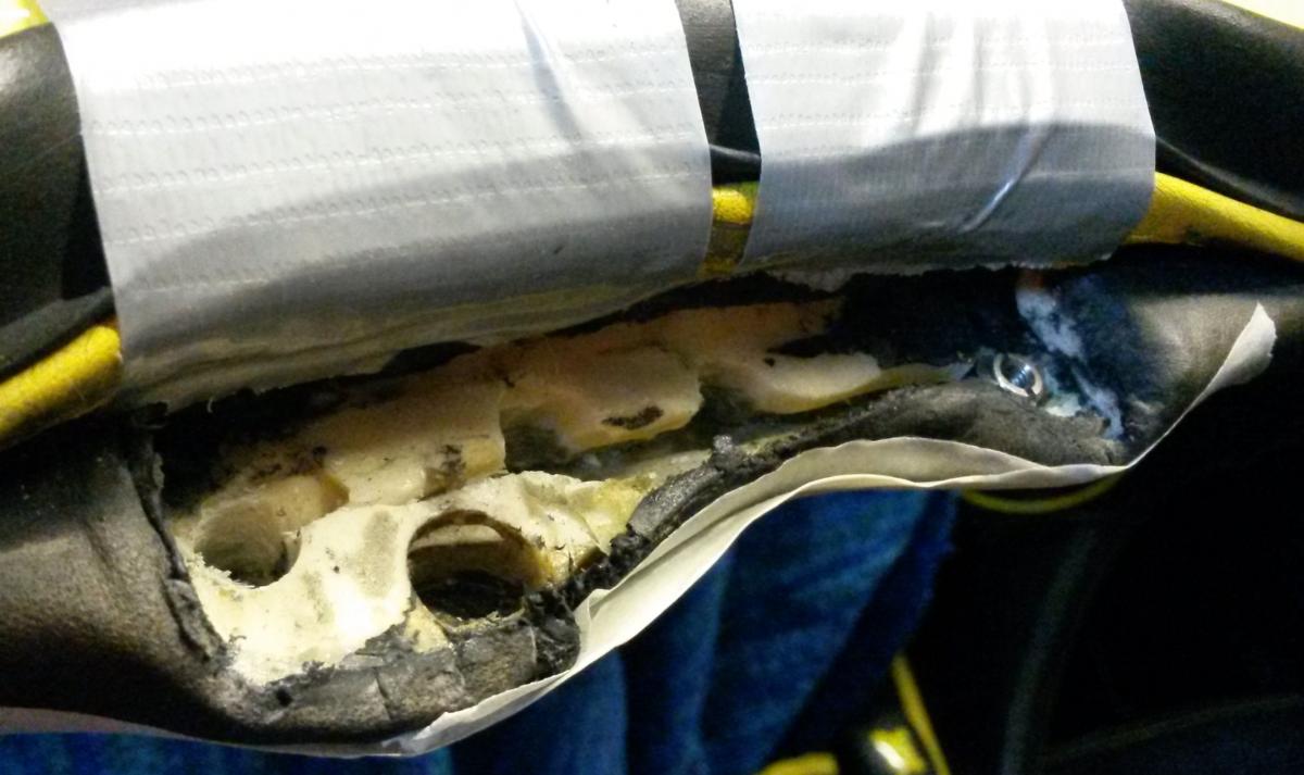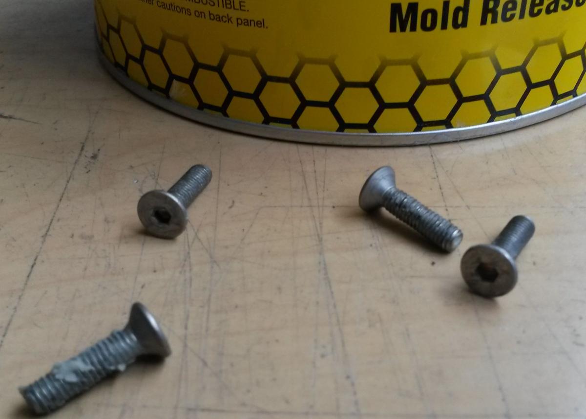 Alle 4 Blechschrauben waren ausgerissen. Das Verriegelungsblech ist nur an den GfK-Scheibenrahmen geschraubt und es hing jetzt nur noch vorne an etwas Karosseriekleber. Darunter sah es wild aus: Zerbrochene GfK-Stücke und Krümel! Diese habe ich alle entfernt und mich dann entschlossen, Gewindeinserts einzukleben, um von den Blechschrauben, zu Gewindeschrauben zu wechseln, was übrigens auf der anderen Seite schon gemacht wurde. Da, wo noch genügend Material war, habe ich die Löcher einfach aufgebohrt (auf 8mm), indem ich das Verriegelungsblech, als Schablone benutzt habe. Da, wo das nicht mehr machbar war, mußte ich die Löcher mit einem kleinen Fräser und einer Minibohrmaschine vergrößern. Das war bei den beiden vorderen Schrauben der Fall, die unter der Dichtung sitzen. Bei den Arbeiten habe ich die Dichtung mit etwas Klebeband nach vorne gezogen, um Platz zu schaffen. Jetzt habe ich die Schrauben gewachst, so daß sie später herausdrehbar sind! Zur Vorbereitung auf das Einkleben, steckte ich die beiden vorderen Schrauben in das Verriegelungsblech und drehte die Inserts auf! Die Klebestelle mußte ich vorher nochmal aussaugen, damit kein Staub mehr drin ist. Zur Verklebung nahm ich kalthärtendes Epoxydharz. Damit später keine Harztropfen auf dem Sitz sind, ist natürlich alles mit einer Plane, oder alten Deck abzudecken!!!! Auch den Rand der Aufnahmefläche des Verriegelungsblechs habe ich mit Klebeband geschützt und abgedichtet! Nachdem ich ca. 40g Harz angerührt hatte (weniger ist schlecht, da sich nicht vorschriftsmäßige Mischungsverhältnisse stark negativ auf die Endhärte auswirken), teile ich das Harz auf 2 Becher auf. Im ersten Becher wird nur eine geringe Menge Kohlefaser-Mehl (zur Verstärkung des reinen Harzes) eingerührt, so daß alles noch sehr flüssig bleibt. Das Harz im 2.Becher habe ich so lange eingedickt, bis es spachtelbar wurde. Zuerst habe ich von der flüssigen Variante etwas in die Löcher laufen lassen. Die Gewindeinserts bestrich ich mit der steifen Variante und setzte die beiden vorderen Inserts in die Löcher. Mit einem kleinen Holz wurde jetzt jeder Hohlraum aufgespachtelt und danach noch mit dem flüssigeren Harz vergossen. Jetzt konnte ich das Verriegelungsblech mit Schrauben und Inserts unter die Dichtung schieben und die beiden hinteren Schauben ebenfalls eindrehen. Bitte nur so weit eindrehen, daß die Schrauben oben bündig abschließen, die Inserts aber ganz tief in den Löchern sitzen!!!! Ich habe zur richtigen Ausrichtung des Blechs, noch das Dach mit der intakten Seite verschlossen und die reparierte Seite von oben mit einen Winterrad beschwert.