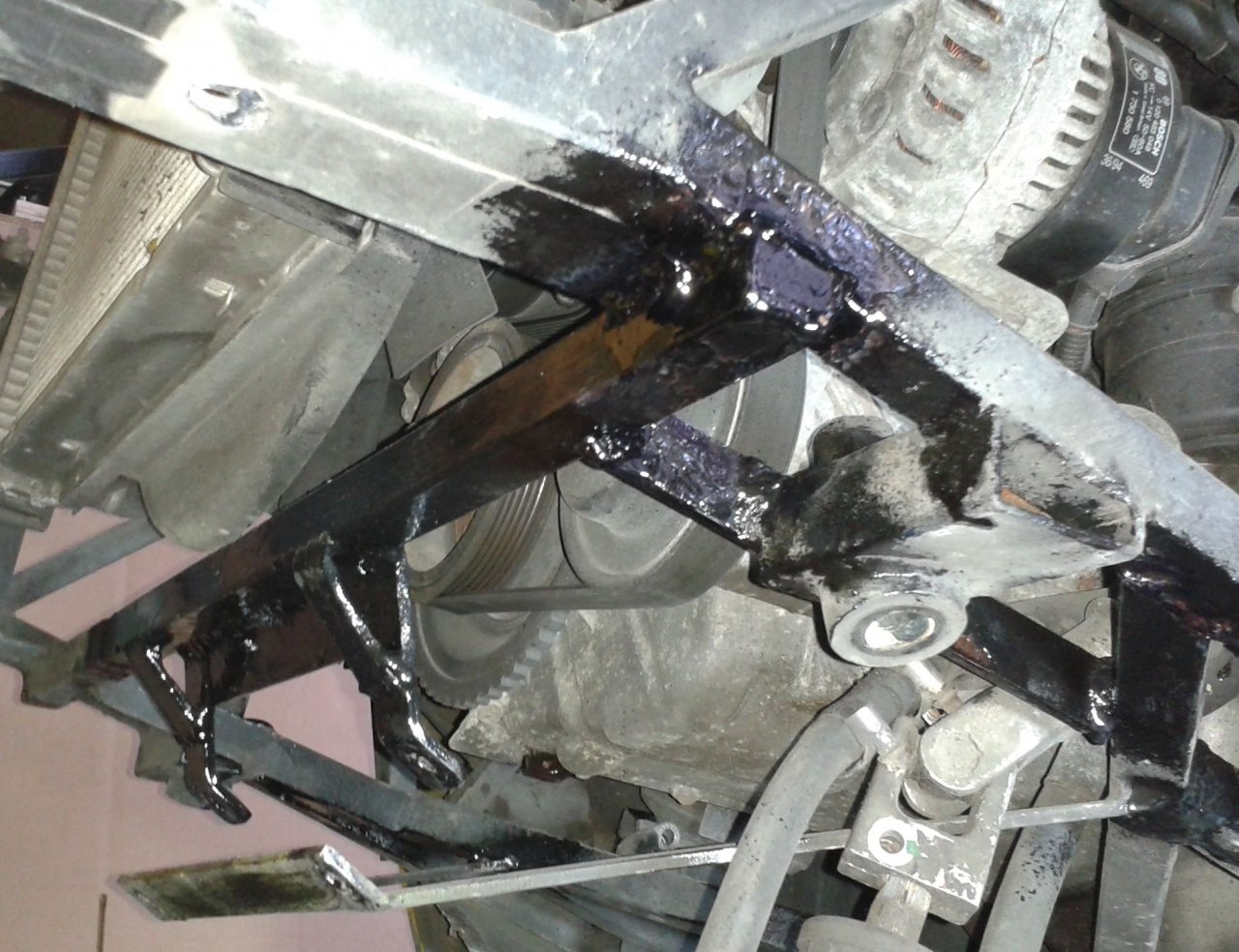 Morgen kann ich die Holraumversiegelung in noch 2 offene Rohre einbringen und diese dann verschließen............Und Hurra: Lenkung, Radträger, Stabi und Federbein wieder einsetzen...........