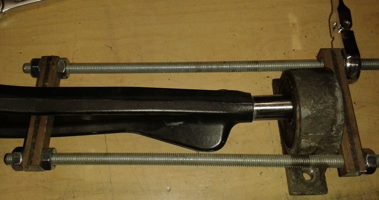 zuerst habe ich heute Mittag die 2.Schicht Rostumwandler gespritzt und ein paar Stunden trocknen lassen. Am Spätnachmittag konnte ich dann Rostschutzfarbe streichen. Ich habe mir noch Neue geholt, die Schwarz Matt wird, da ich das passender finde, als glänzenden Lack. Da die neuen Querlenker auch schon gekommen sind, habe ich heute die Avus-Lager von den alten Querlenkern herunter geholt und mir ein Aufziehwerkzeug gebaut, mit dessen Hilfe ich die Lager auf die neuen Querlenker pressen konnte.