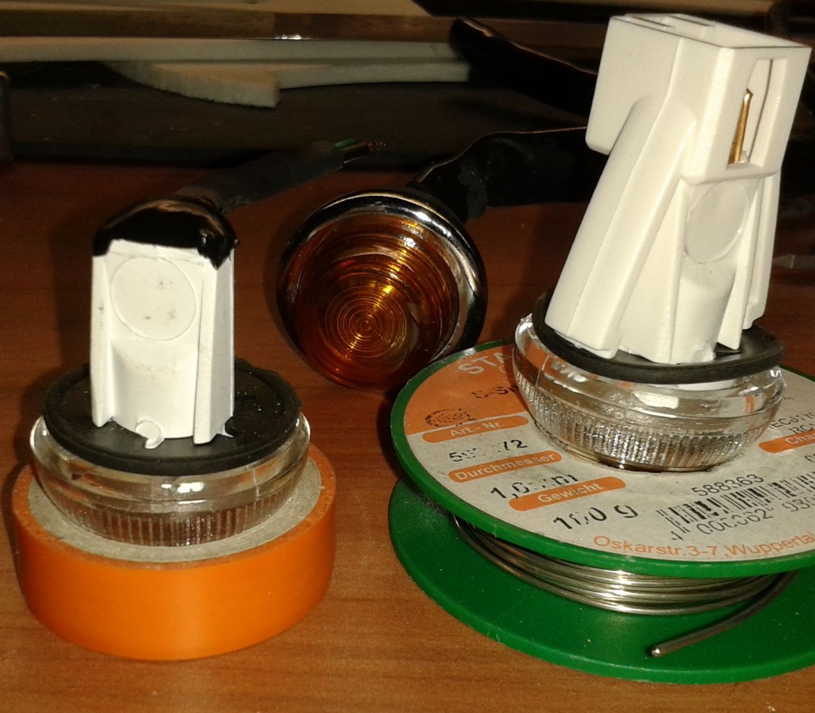 Jetzt hatte ich ja Wartezeit, in der ich mich schon mal der Seitenblinker angenommen habe. Die häßlichen Dinger die für England rein kamen fliegen raus und schöner geformte in weiß kommen rein. Da diese aber zu lang sind, habe ich sie hinten extrem kürzen müssen und Kabel direkt angelötet. Zum Schluß kam Plastidip drauf, damit alles wieder dicht ist!