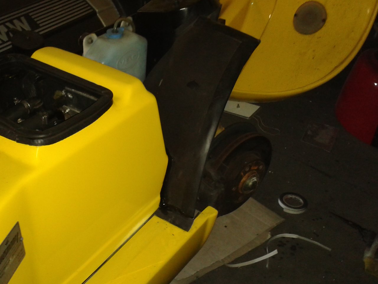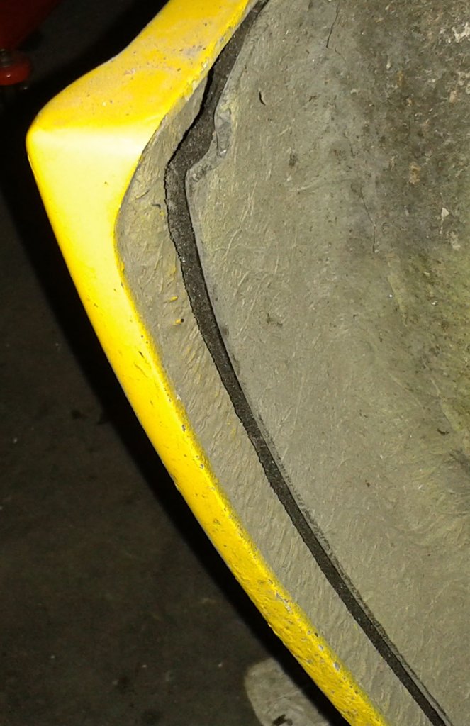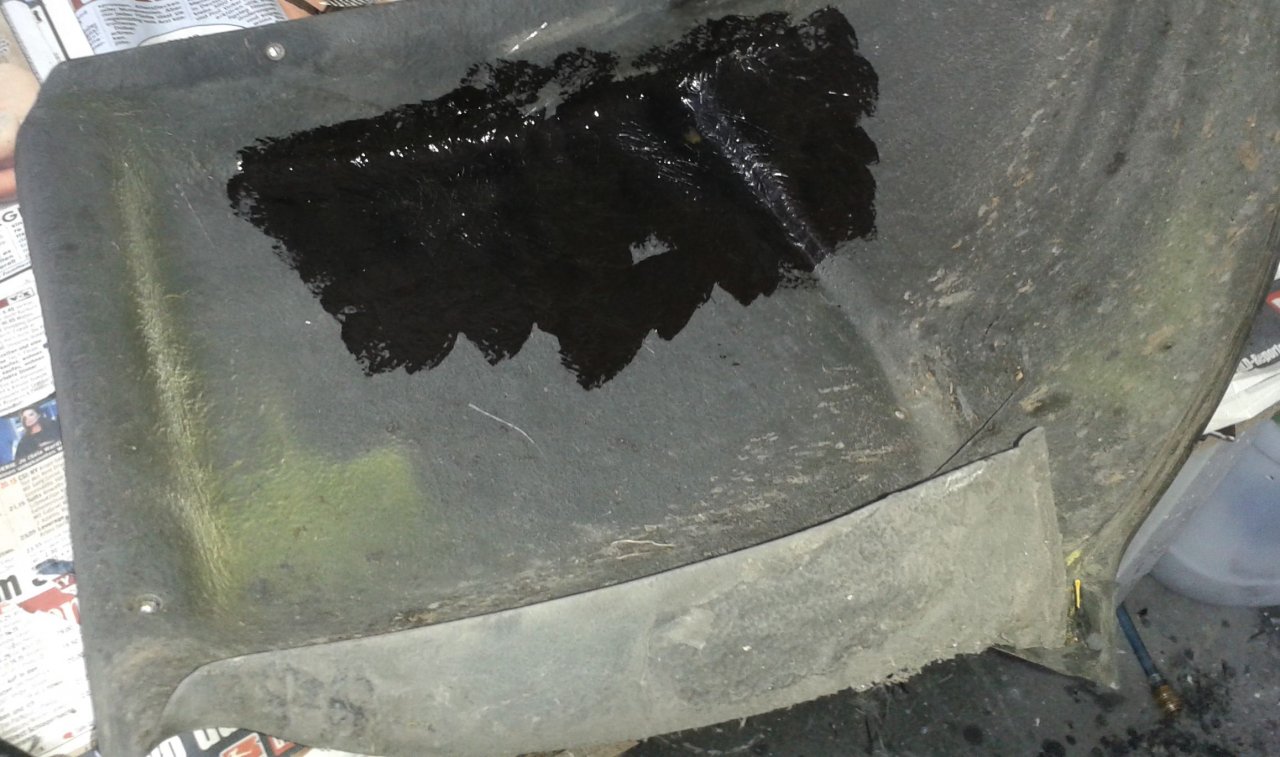 Heute Vormittag war ich schon mal in der Werkstatt, um die Hohlraumversiegelung einzubringen. Die kann dann nämlich bis Nachmittag trocknen, damit ich weiter machen kann. Einer der Innenkotflügel vorne wurde auch mal grob mißhandelt, hatte 2 Löcher (Beide sind so nicht vorgesehen) und ein Befestigungsschraube steckte noch im Rahmen mit einem Stückchen GfK! Zurzerhand hab ich es zu laminiert...........