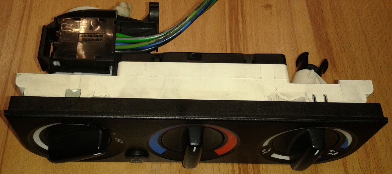 Ich will wieder das Heizungs-Bedienteil einbauen, das bei Wiesmann immer eingebaut wurde. O.H. meine darauf verzichten zu müssen, um ein Doppel-DIN-Navi-Radio einbauen zu können. Ich möchte aber Originalzustand! Deswegen bersorgte ich mir schon vor einiger Zeit, bei ebay ein Bedienteil vom BMW E36. Jetzt muß ich es so modifizieren, das es paßt! Nachfolgend mal die Ausgangsbasis: