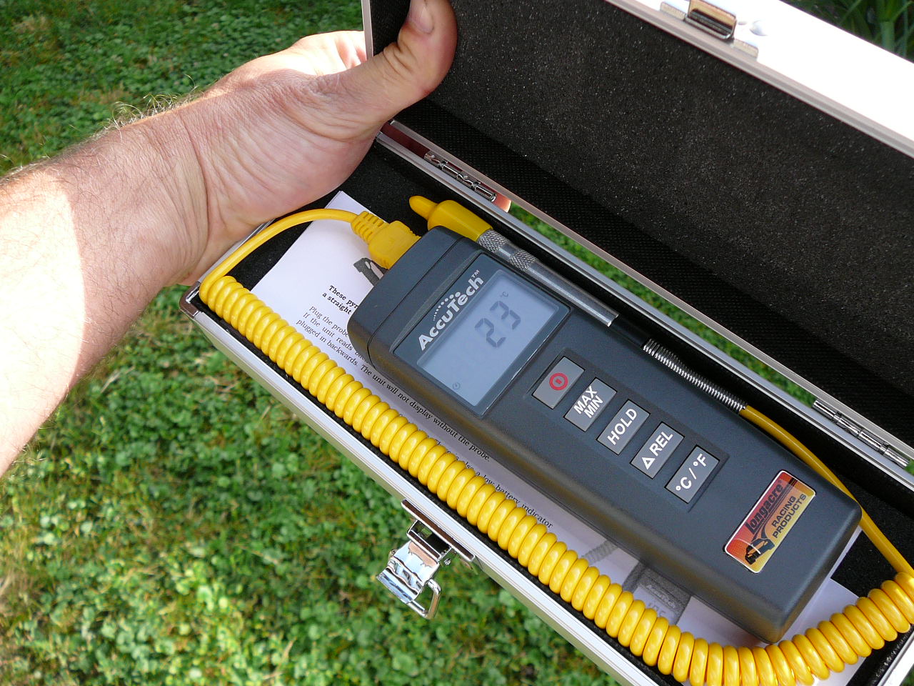 Da aber das Aussteigen Zeit kostet und die Reifenoberfläche doch recht schnell abkühlt empfiehlt sich statt einem Infrarotmessgerät das die Oberfächentemperatur misst eine Messpitze die 2 bis 3mm "IN" den Gummi sticht da dort die korrekte Temperatur noch gespeichert ist.