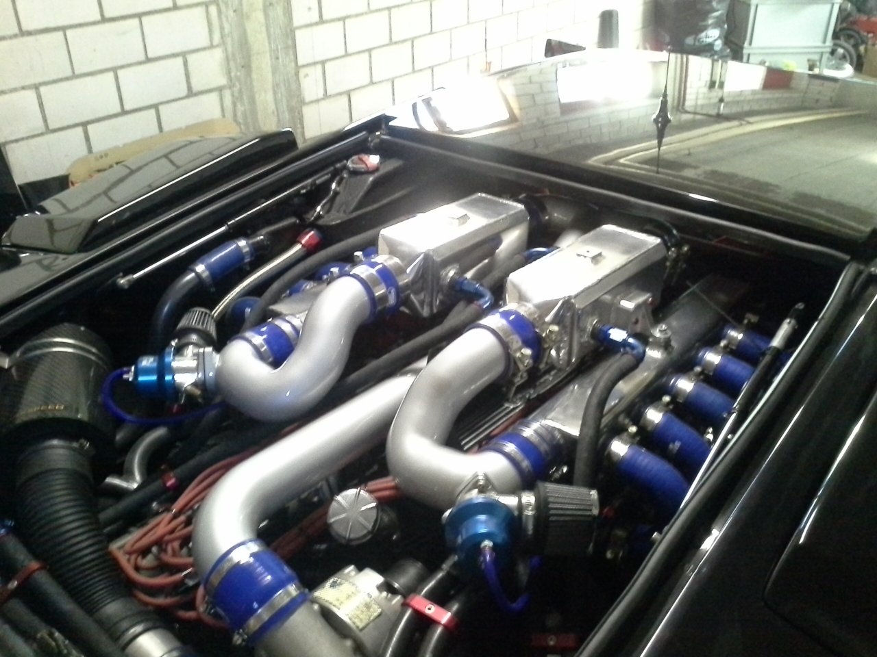 Es wurden Abstimmungsarbeiten durchgeführt... Leider war ein Bypassventiel kaputt und es konnte keine genaue Leistungsmessung durchgeführt werden. Der Countach hatte genau 300 DIN PS bei 6800 U/min ohne Ladedruck. Orginal dreht der 400s bis 8000U/min. Habe Ihn aber bei 7500U/min begrenzt. Bei vollem Ladedruck sollten noch zusätzlich 150-180PS mehr anstehen....