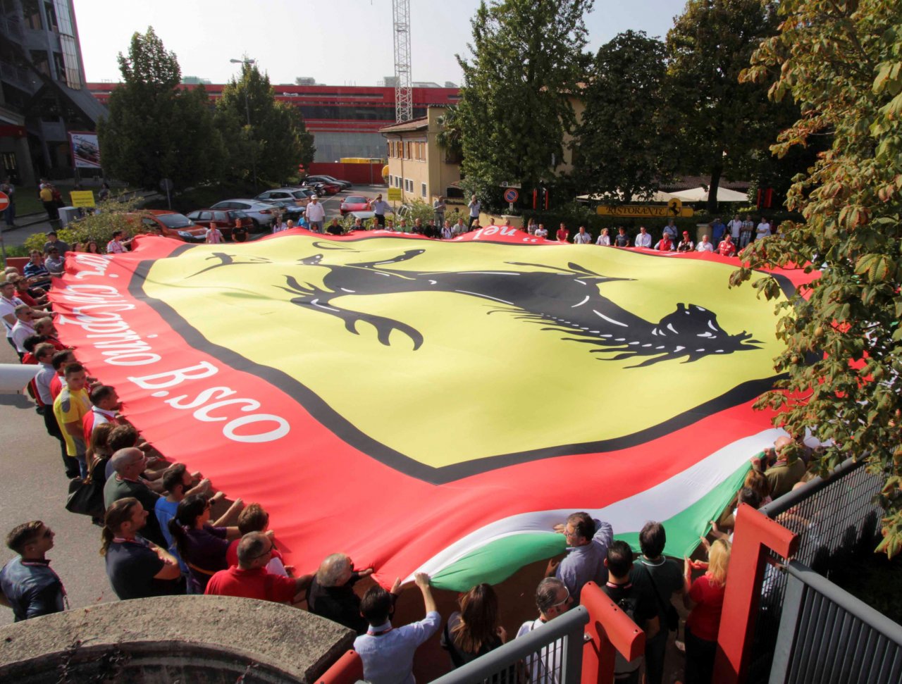 The Caprino Bergamasco branch of the Scuderia Ferrari Club, the one with the most members of any Ferrari club in the world, made a point of bringing along the giant heart flag, that features the Scuderia Ferrari logo. It is now a regular feature of the Monza Grand Prix and today, it was unfurled at the factory entrance in Via Abetone, as the fans shouted out “Thank you President, you will always be in our hearts.” The sentiment was aimed at the man who has contributed more than anyone to Ferrari’s success, with 14 world titles won in the past 15 years and no less than 118 races won during his Presidency. As the flag with the giant heart and the Prancing Horse was unfurled, the tourists visiting the nearby Ferrari Store, along with passers-by all joined in the commotion with motorists hooting their horns.