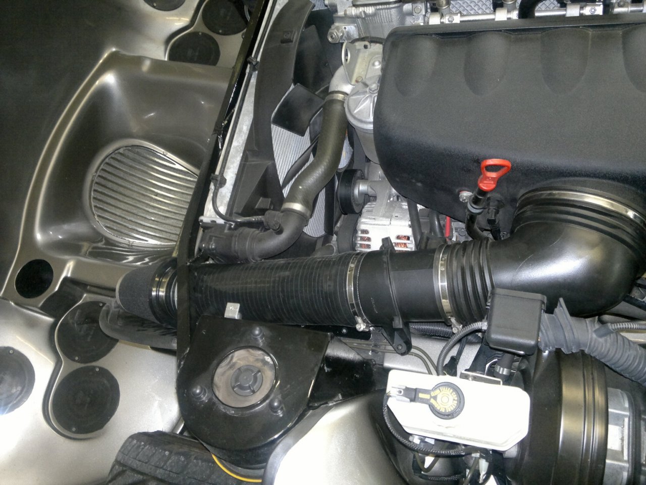 Der Ansaugrüssel muß dann vor dem Kühler atmen, da wird's platzmäßig eng. Bei mir ist dort der LMM verbaut, der jetzt "unzurechtgefeilt" (wie ab Werk) paßt und einfach zu ersetzen ist.