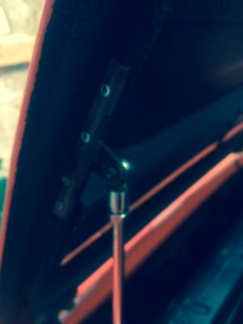 Nächste doofe Sache, Fronthaube wird ja nur durch diese kleine Stange gehalten. Sieht so aus, als ob da jemand schonmal versucht hat, diese zu schliessen, ohne die kleine Kugel reinzudrücken, auf alle Fälle ist eine kleine Beule auf der Haube.: