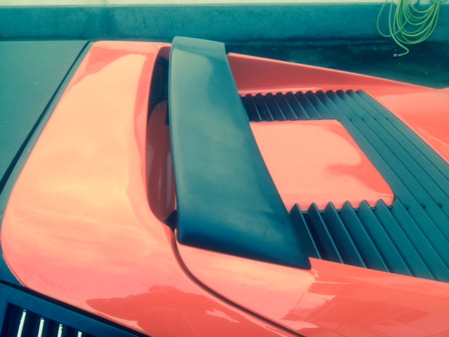 Nächster Mangel, die Batteriewarnleuchte brennt, ziemlich doof, hoffentlich nicht die Lichtmaschine, lass es der Keilriemen sein! Schau ich mir die Karosse an, so stellt man fest, dass der Wagen 32 Jahre alt ist, der Lack hat bereits den Zenit überschritten, auf der Motorhaube ist er rissig. Nächster Mangel, an der Beifahrertür, unten an der Kante, Rost (1 Eurostück große Ausbeulung des Lacks) Noch eine defekte Lackstelle am Frontspoiler, da kann es ja kein Rost sein.