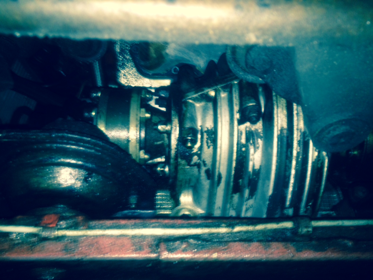 Motor von unten, schon ein leichter Ölfilm überall drauf, die Manchetten machen auch einen Ölgetränkten Eindruck