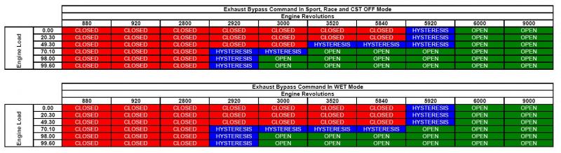 Ferrari schließt die Klappen generell im unteren Last- und Drehzahlbereich. Das ergibt für mich einen gewissen Sinn, wenn man das Drehmoment in diesen Bereichen mittels höherem Abgasgegendruck optimieren möchte. Bei hohen Drehzahlen wiederum ist eine geschlossene Abgasanlage mit entsprechend hohem Gegendruck eher kontraproduktiv. Soweit mein Verständnis. Wie kommt man aber dazu (basierend auf meinen soeben getätigten Aussagen), ausgerechnet im WET-Modus im mittleren Drehzahl- und Lastbereich das Drehmoment zu erhöhen? Eigentlich möchte man unter diesen Bedingungen doch gerade das Gegenteil erreichen, in konventionellen Autos würde man dazu z.B. einen Gang höher schalten... Wo ist da mein Denkfehler?