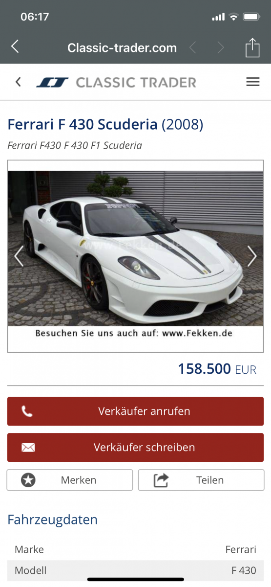 Doch, das sind schon einige, habe damals bei meiner Suche die Leistung als Filter benutzen müssen, um nicht beinahe doppelt soviele Fahrzeuge angezeigt zu bekommen, was ich als störend empfand. Der hier besprochene Kandidat ist nicht der einzige, der unbedingt das Wort Scuderia in der Überschrift verwenden musste, um sein Angebot hervorzuheben.
