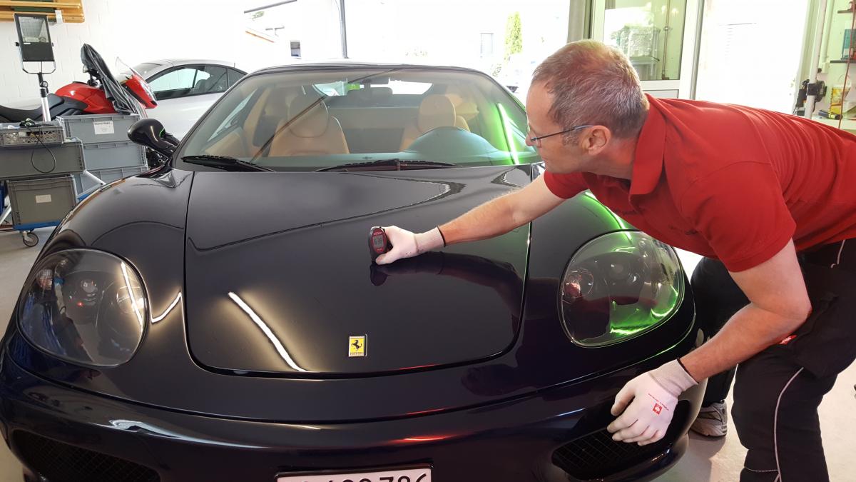 Ein Schichtdickentest bestätigte, das der Wagen bloss an der Frontpartie nachlackiert wurde, so wie damals Carrotec vor 2 Jahren im Rahmen der Frühlingsauffrischung vorgenommen.