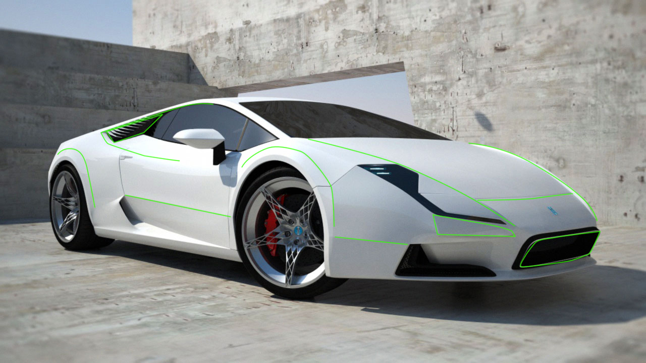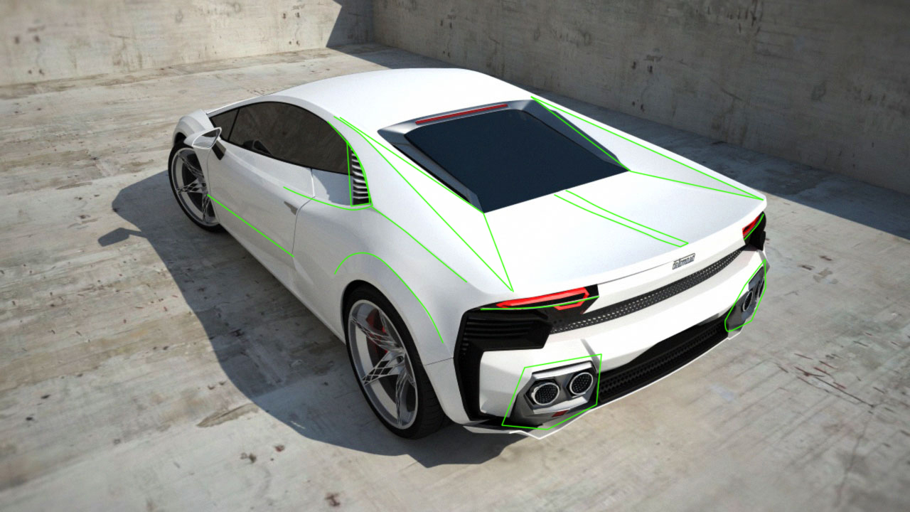 Und ohne mich jetzt zu weit aus dem Fenster lehnen zu wollen: Ich behaupte mal, dass der "Otto-Normal-Sportwagenfahrer" bei der von ihnen erstellten Studie ohne die grün eingezeichneten Hilfslinien die Zitate nicht erkannt hätte. Da fallen dann eher die scheinbaren "Gleichheiten" zum Gallardo und Huracán ins Auge und damit wird ein schönes Konzept direkt innerlich als "Kopie" abgestempelt und beiseite gelegt.