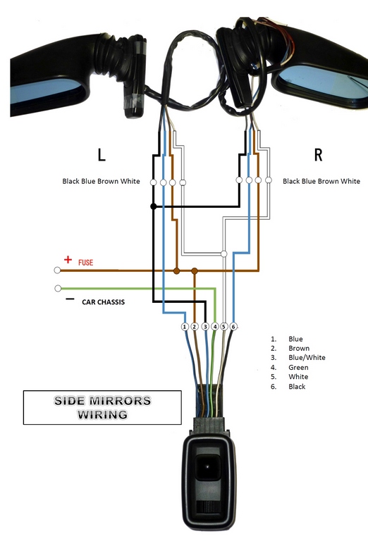 da ich mir vor meiner Abreise schon mal Gedanken über meine Aussenspiegel gemacht habe, ist meine Wahl auf den elektrischen 328 Spiegel gefallen. Nach mühevoller Suche nach den benötigten Komponenten, könnte es nun losgehen ...wenn da nicht die Sache mit der Verkabelung wäre. Wenn schon neue Spiegel, dann sollten es auch gleich 2 sein, d.h. Kabel von der Fahrerseitigen Tür zur anderen Seite legen. Sollte ein Forum Mitglied auch an einen 2. Spiegel denken, möchte ich mein kleines Schaltbild dazu nicht vorenthalten.