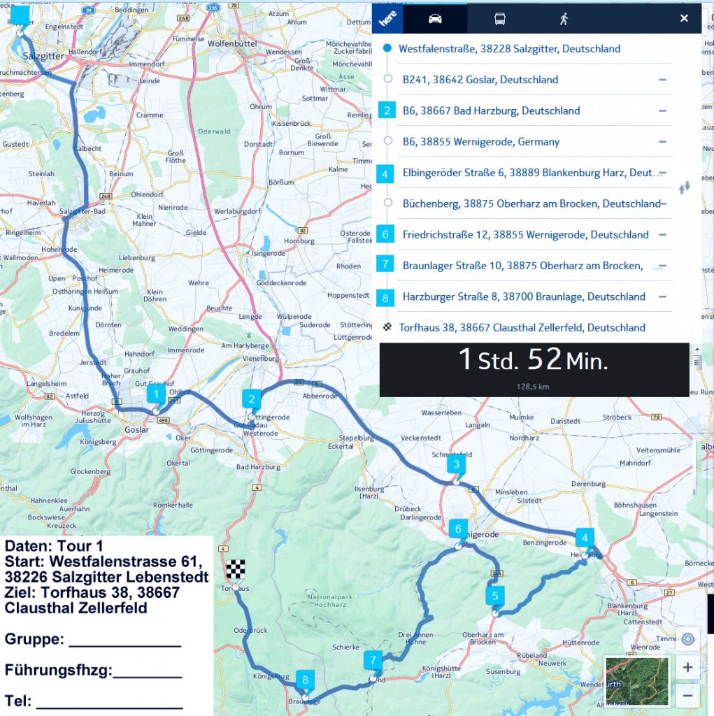 Torfhaus -> Altenau -> Am Okerstausee entlang -> Mittelschulenberg (Richtung Claustahl-Zellerfeld) -> Erbprinztanne -> Kreuzack -> Lautentahl -> Tropfsteinhöhle -> Münchehof -> Herrhausen -> Seesen -> Langelsheim -> Innerste -> Ziel (Restaurant)
