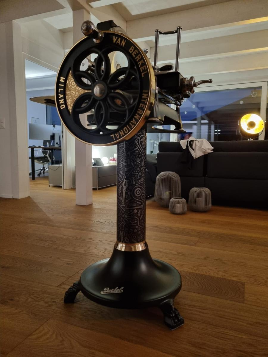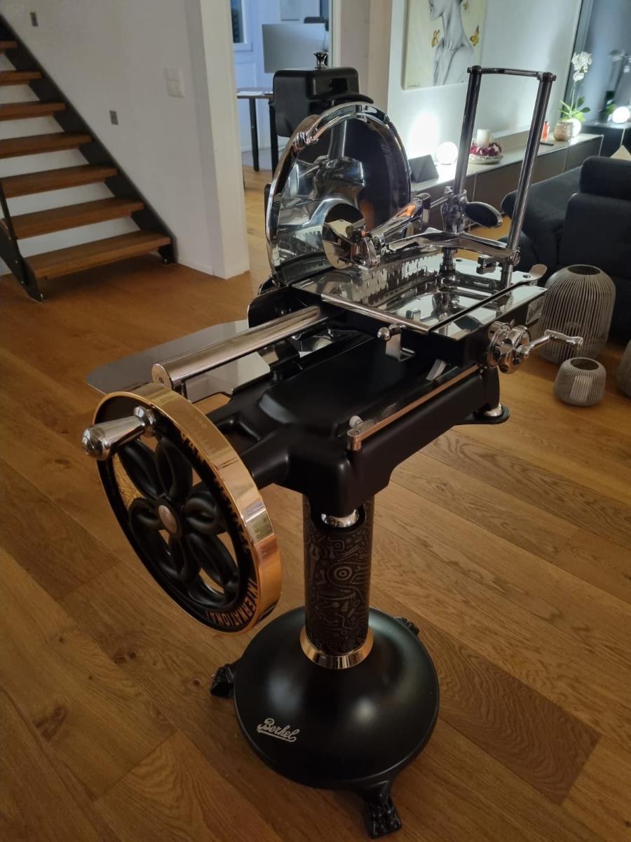 Seit langem, schauen wir uns immer wieder schöne Berkel Ausschnitt Maschinen an und jetzt haben wir zugeschlagen. Die Berkel volano b114 journey special edition, hat es uns angetan. Die Auflage ist mit 100 Stk. limitiert und eifach ein unglaublich schönes Kunstwerk. Ich Poste in ca. 14 Tagen ein zwei Bilder, wenn die zwei Europaletten angekommen sind. ;-)
