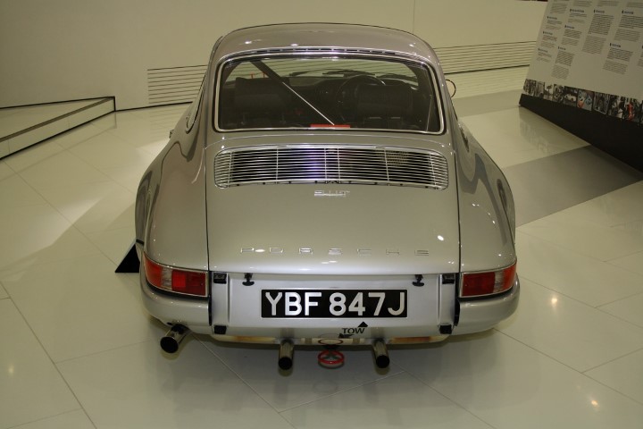 Porsche 911T mit originaler Sportabgasanlage und drei Ausgängen: Der dritte Ausgang links bei mit Metallkappen verschlossenen Mittelrohren entspricht dem heutigen Modus "Klappen geschlossen". Ist das linke Rohr mit einer Metallkappe verschlossen und sind die beiden Mittelrohre offen, entspricht dies dem heutigen Modus "Klappen geöffnet".
