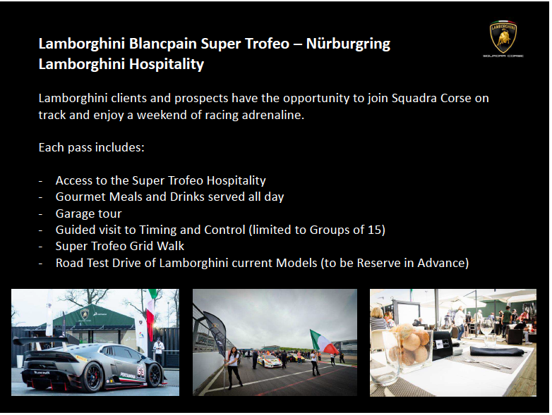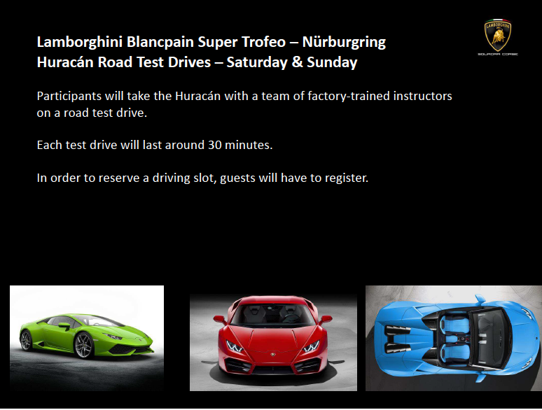 Rennerlebnisse, Lamborghini Hospitality, Testdrives, Boxengasse, etc.